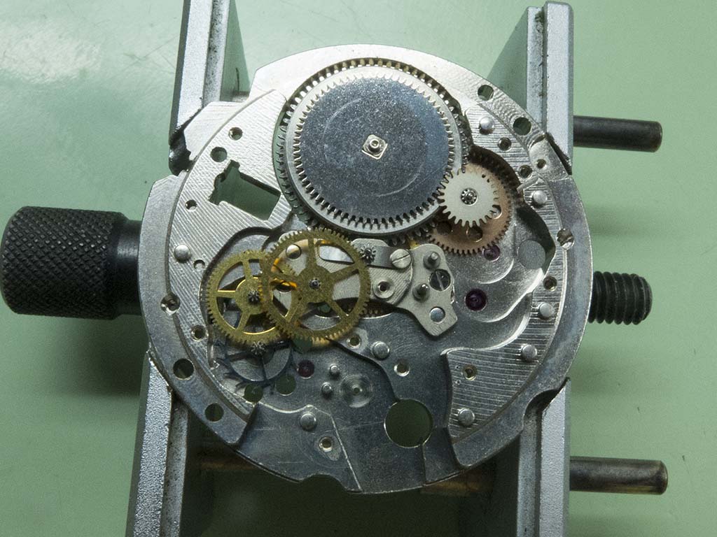 With the movement turned over the rotor can now be removed to allow the case to be held in a clamp.