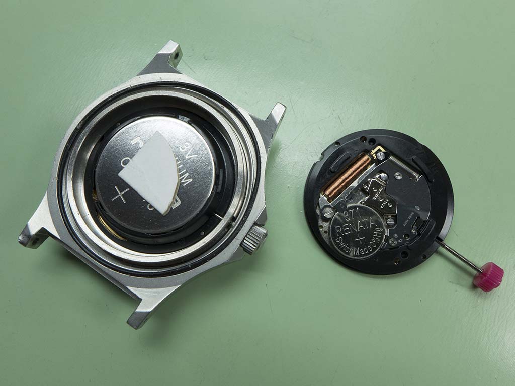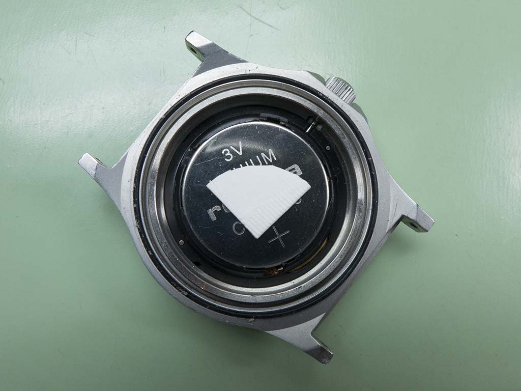 With the back removed the large lithium battery can be seen, this is the ‘Li’ part of the movement and the battery lasts a lot longer (10 years I believe) than the 371 battery of the 715 movement. It looks like someone’s tried to force the battery down a bit further with a piece of packing to see if that would get it going. It didn’t!