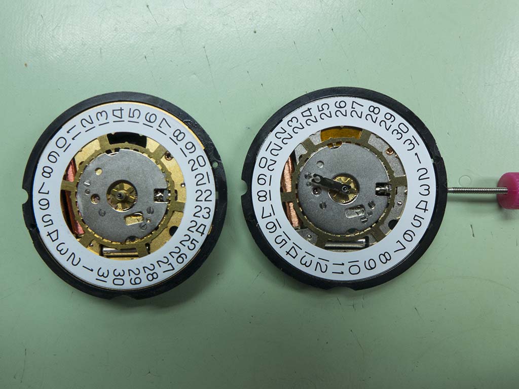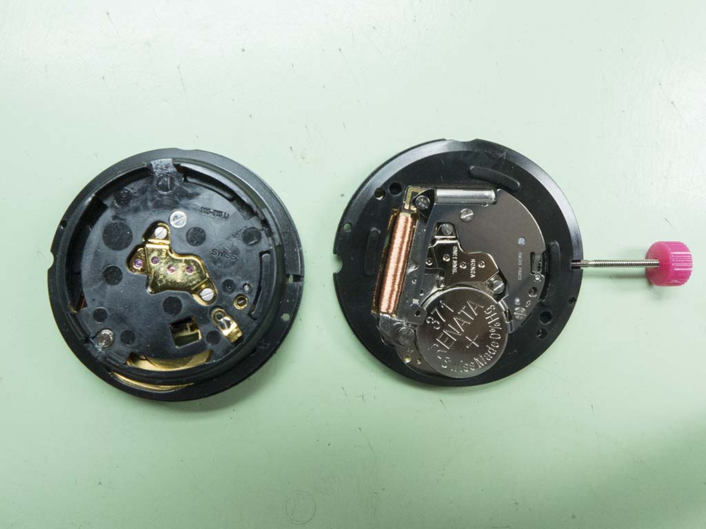 The battery holder is the first thing to be removed from the dead movement, underneath they look a lot more similar now.