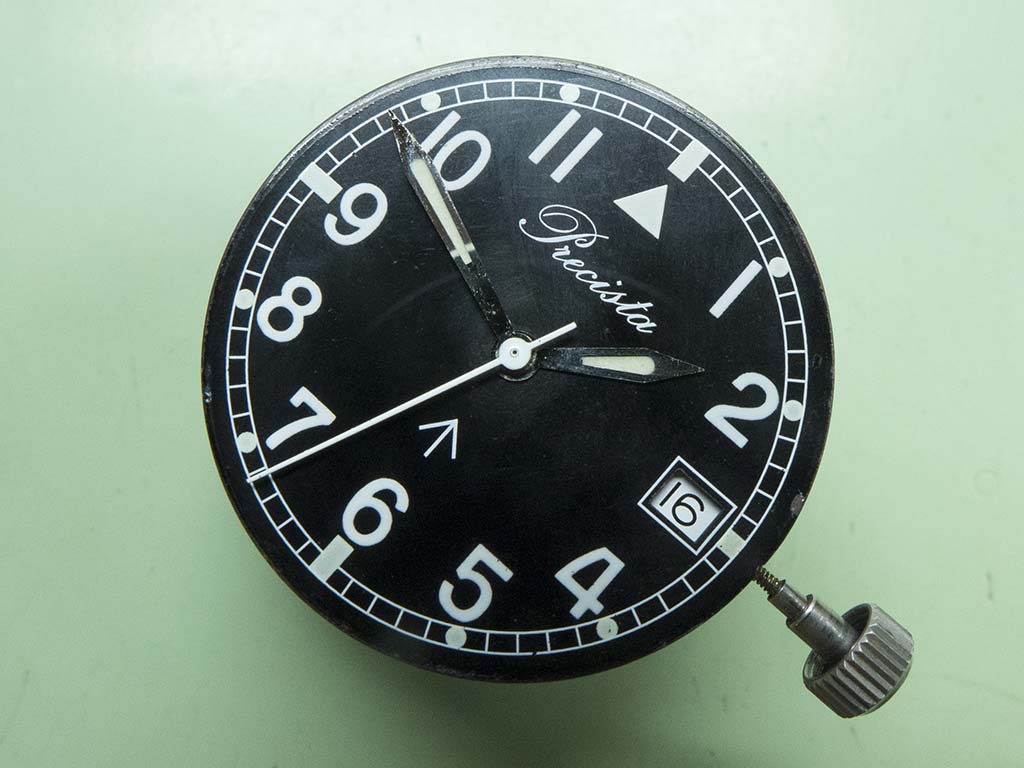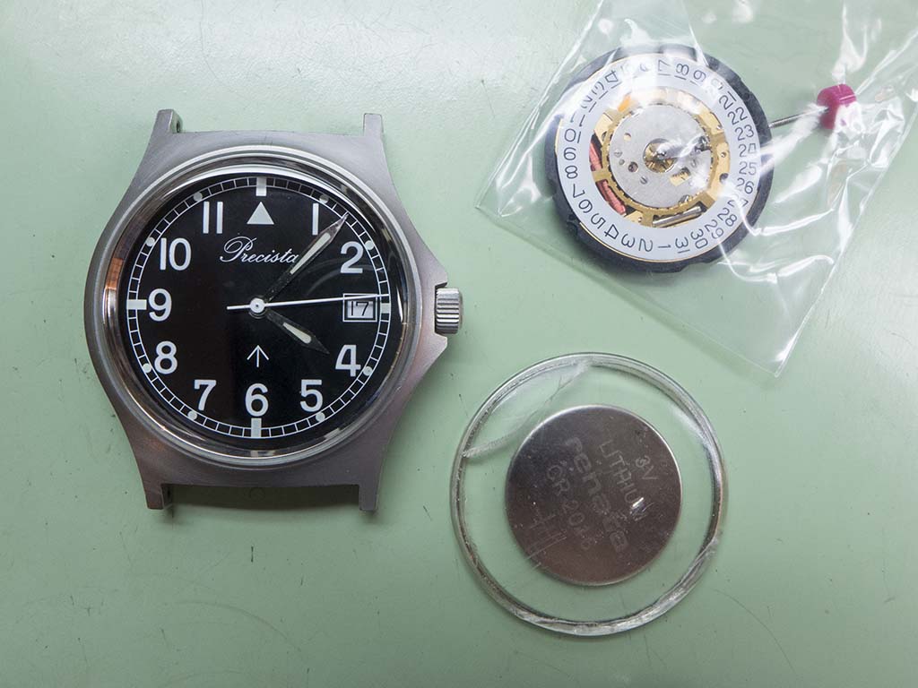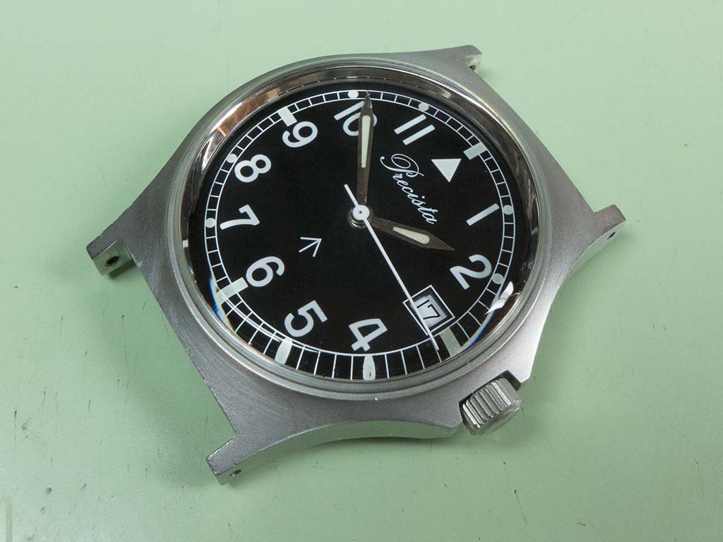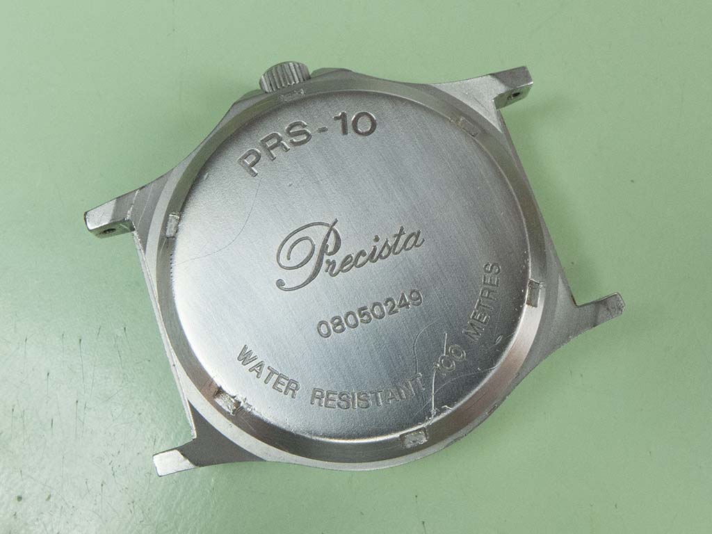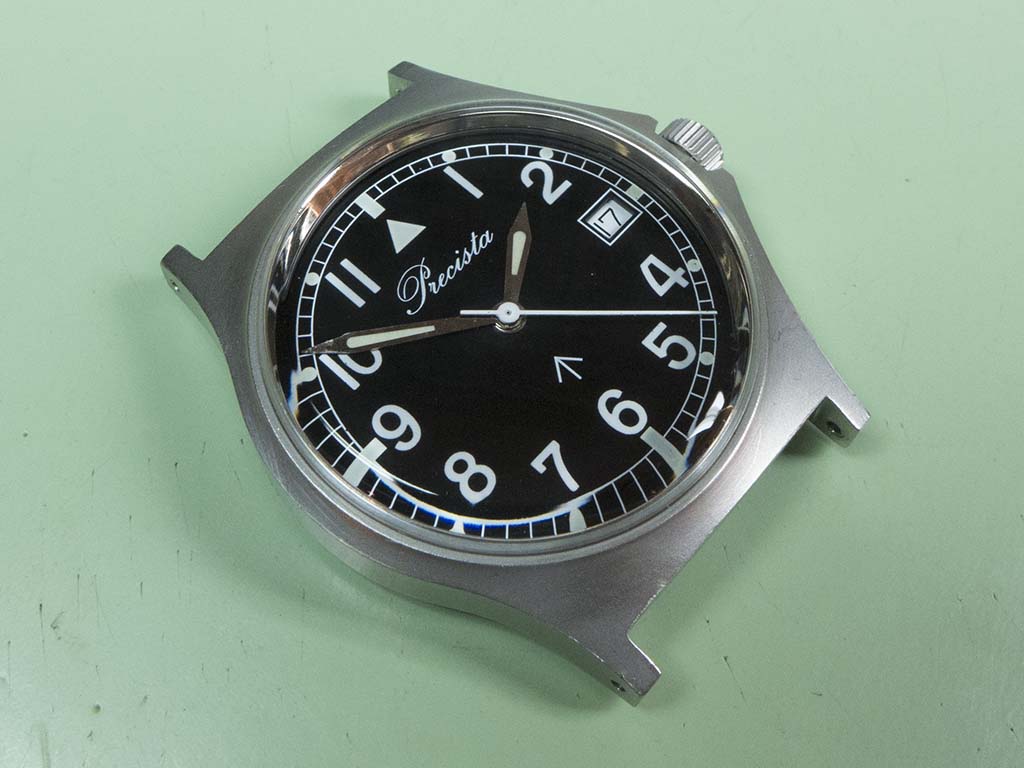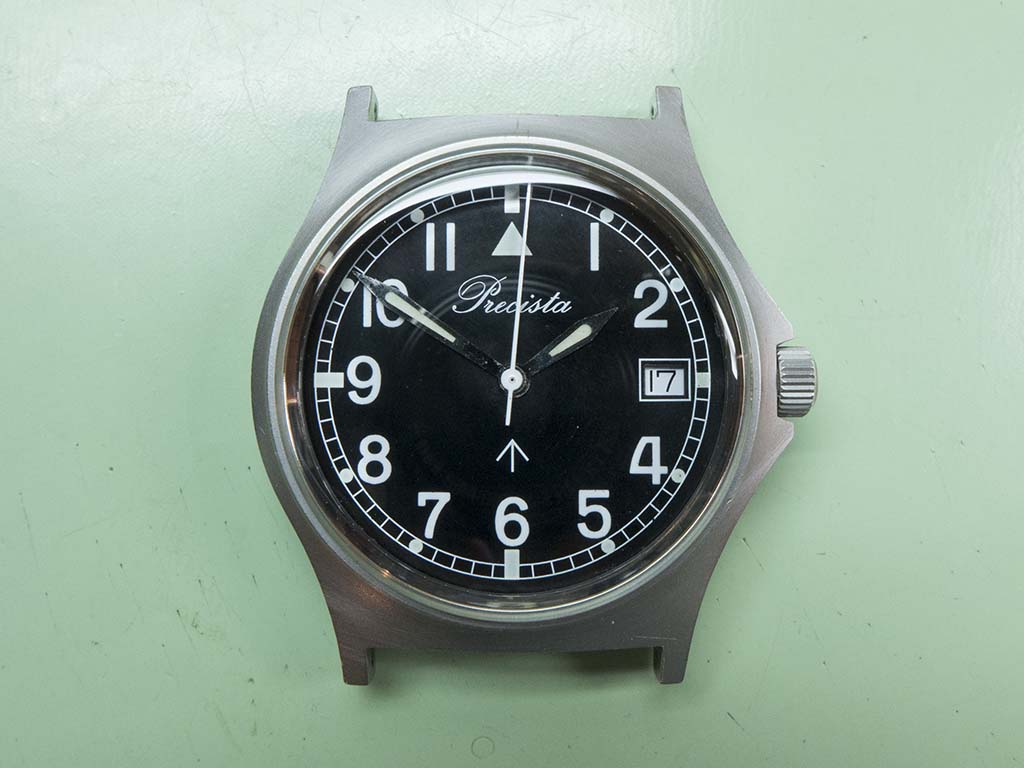 This Timefactors PRS-10 came in with a stopped movement and a cracked crystal recently. These watches are based on the military-issue Precista G10 from the early 1980s and even carry the same name on the dial due to the fact Eddie Platts (the Timefactors proprietor) actually owns the trademark. I presume the movement had stopped due to water ingress as the insides were very mucky and there was a whacking great stretch of crystal missing around the circumference!