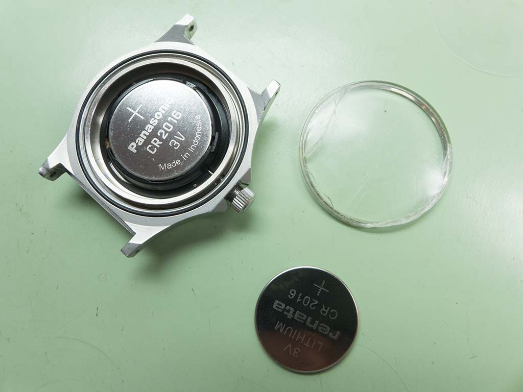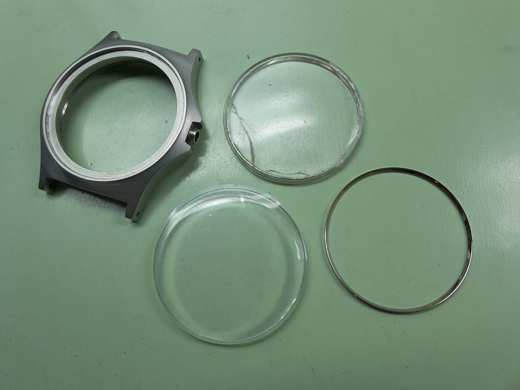 The old crystal was pressed out and the case components were cleaned ready for the new one.
