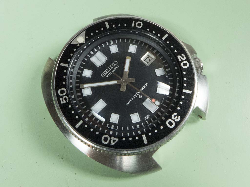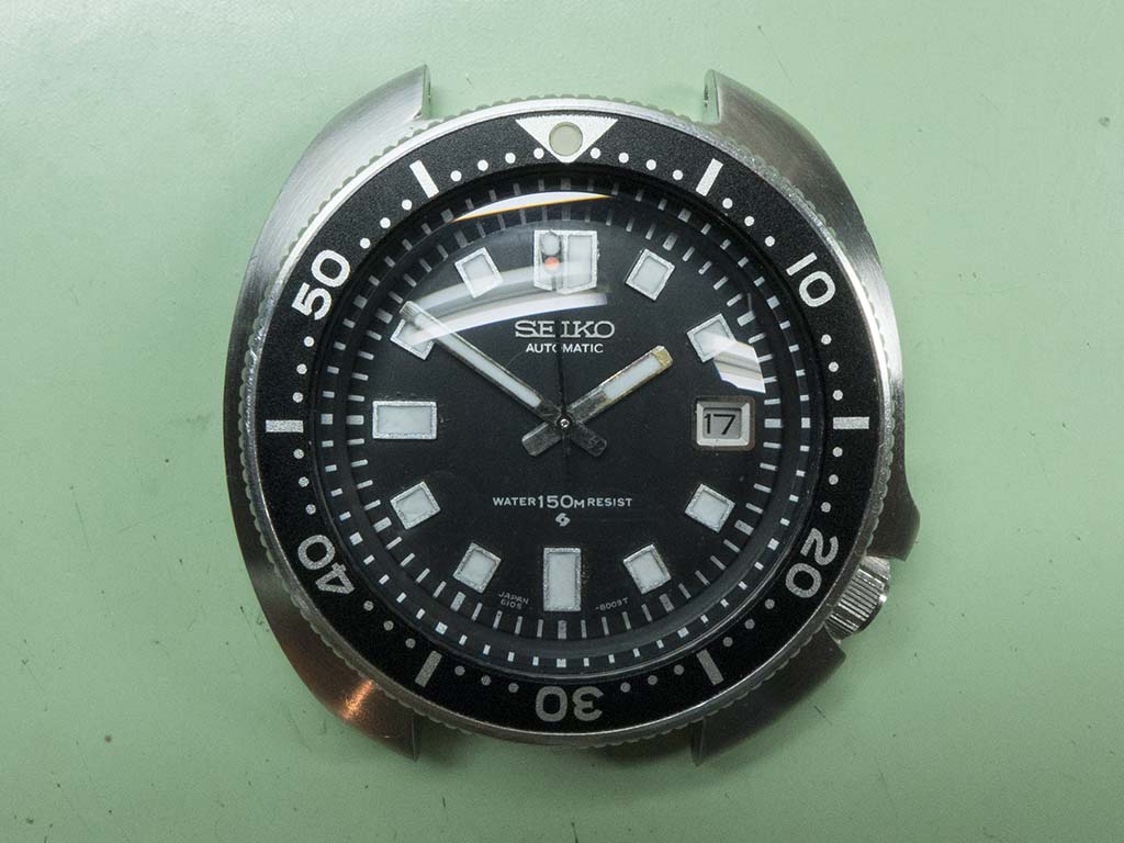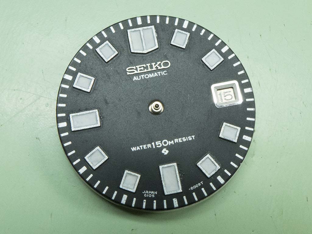 In contrast to the last 6105 featured this one must have spent a lot of it’s life in a humid climate and as the seals slowly failed moisture got in it made mincemeat of the lume. As can be seen the hands must have been so far gone they’ve been substituted with an incorrect set, these look like they’ve come from a Seiko Sports 5126-8100. You can see from this shot the damage moisture can do to lume and the surrounding frames.