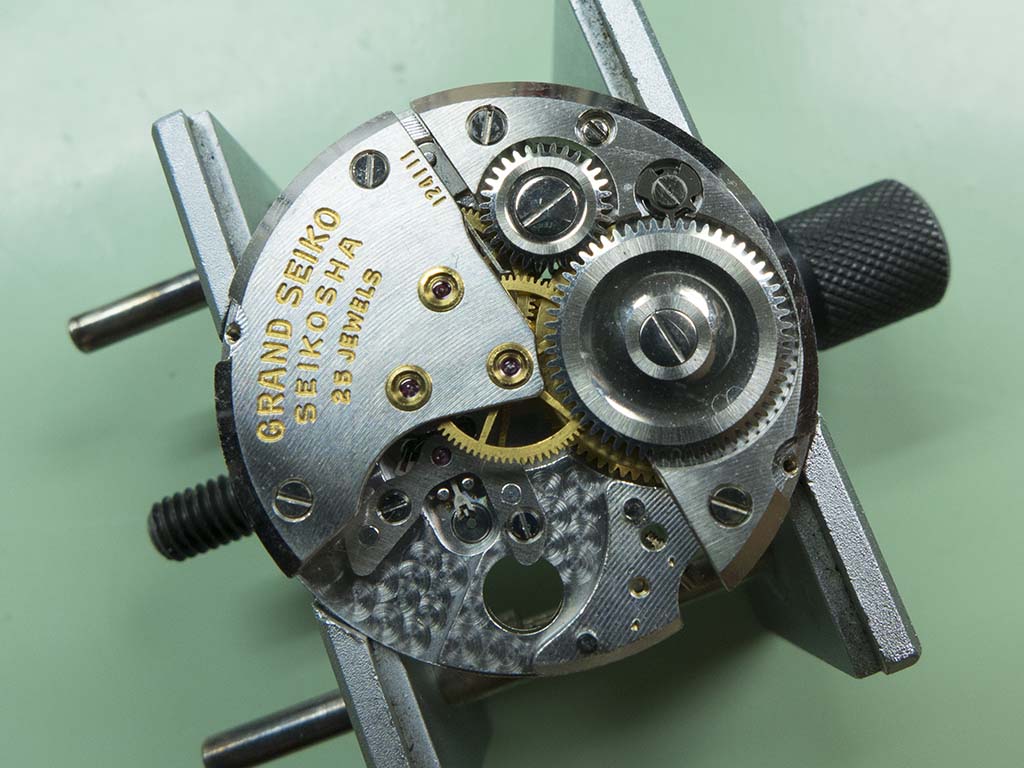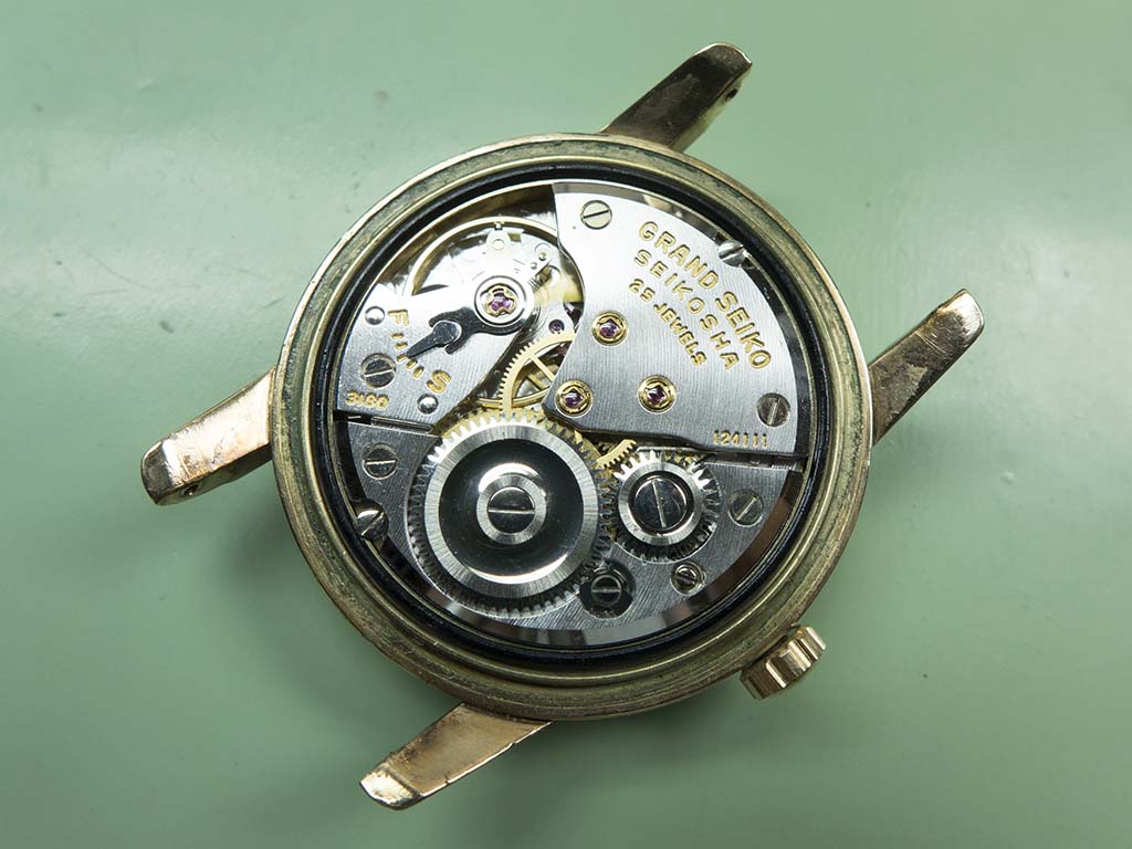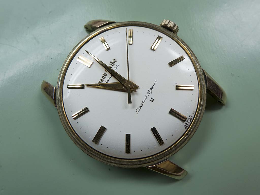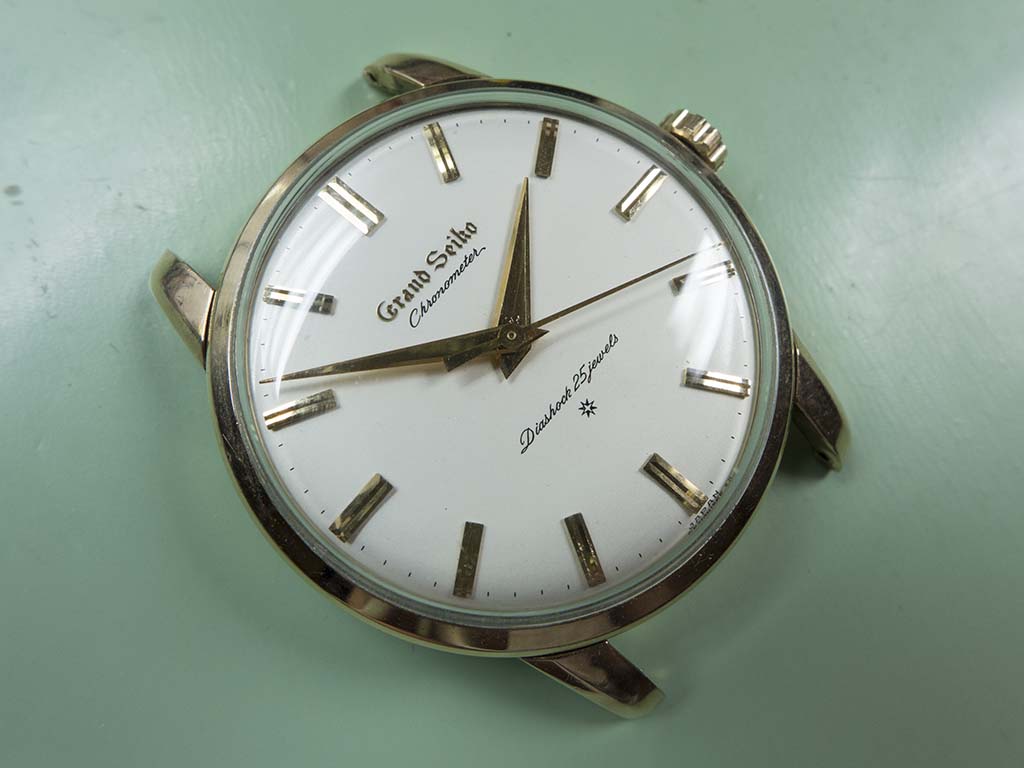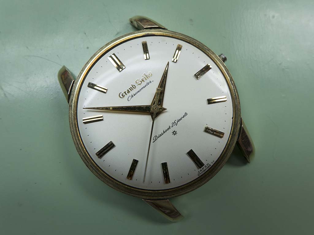 This lovely Grand Seiko arrived in a non running state, the power couldn’t be wound on so there was obviously a problem with the mainspring or barrel. The Grand Seiko line was introduced in 1960 with the introduction of the calibre 3180 and continued in various guises until 1975 when it took a 13 year sabbatical. The brand was revived with introduction of the Grand Seiko 95SG quartz in 1988. The subject of this article is the original Grand Seiko, a calibre 3180 beauty, a manual wind, 18,000bph, 25 jewel, self certified chronometer grade movement. It was certified internally rather than by the Swiss COSC body, but to standards even more stringent than the Swiss organisation’s. The original Grand Seiko went through a few subtle changes during it’s 4 year life span, notably the distinctive Grand Seiko script on the dial started out being printed directly onto the dial in black, it then went to being carved into the dial and finally applied in gold as in the one featured. The cases were all 14K gold filled (as in rolled gold, a thicker version of gold plating) but a few were produced in platinum. I’ve yet to see a platinum cased example but I do know the owner of the one featured here has one complete with it’s original box and all it’s chronometer certificates. I’m not envious at all 🙂