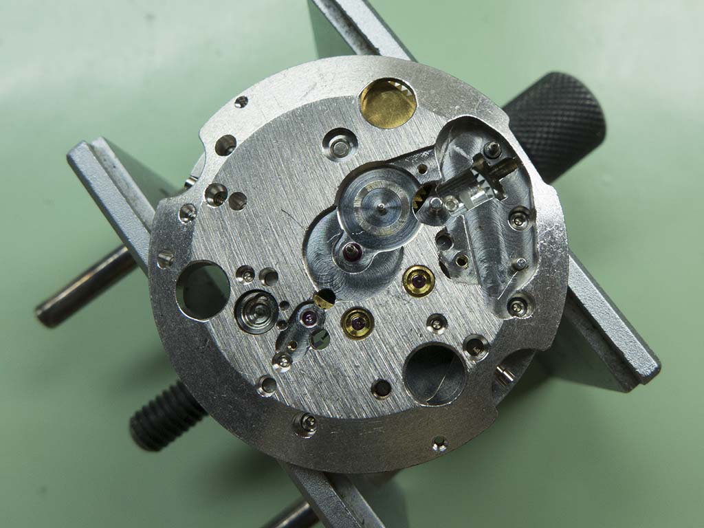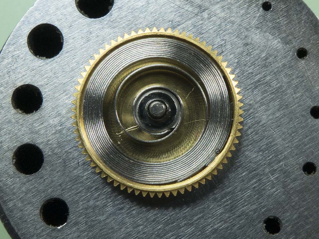 Because the case construction is of the traditional type the movement has to be withdrawn from the dial side, so to prevent any possibility of damage I remove the balance assembly first. I also removed the three diafix springs and end jewels whilst I was at it.