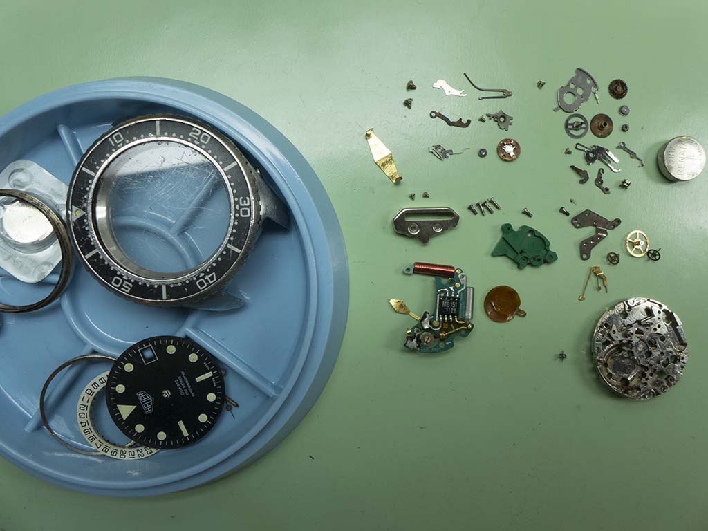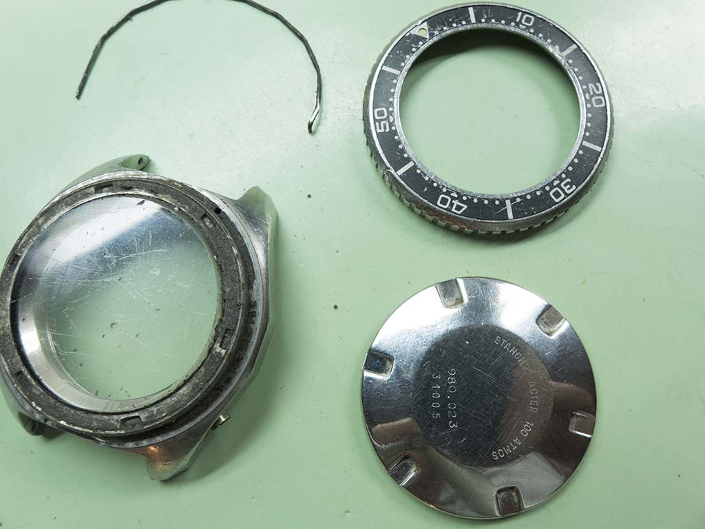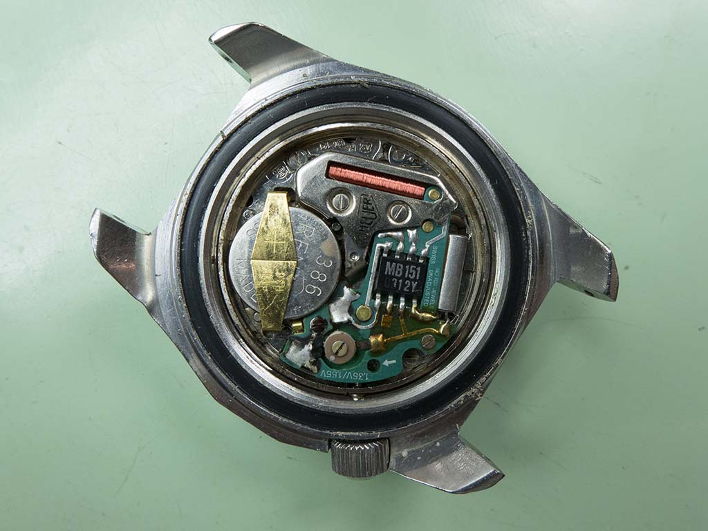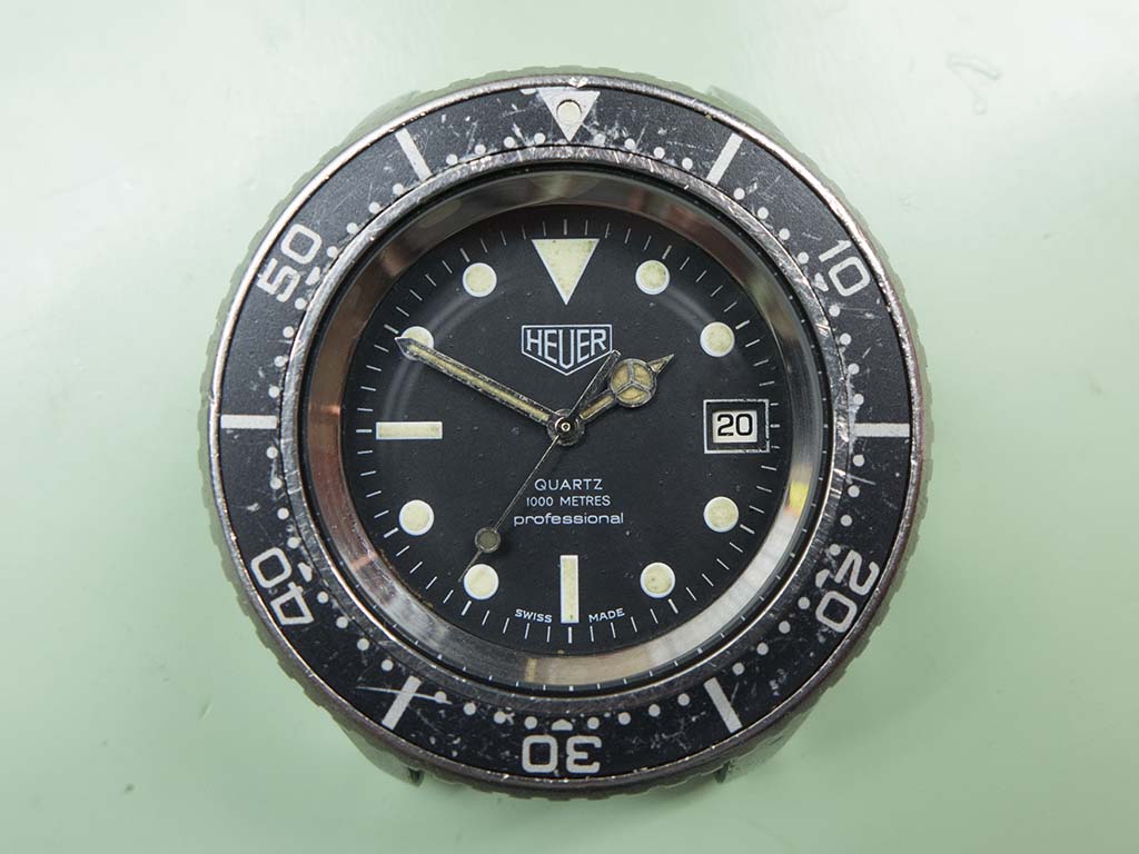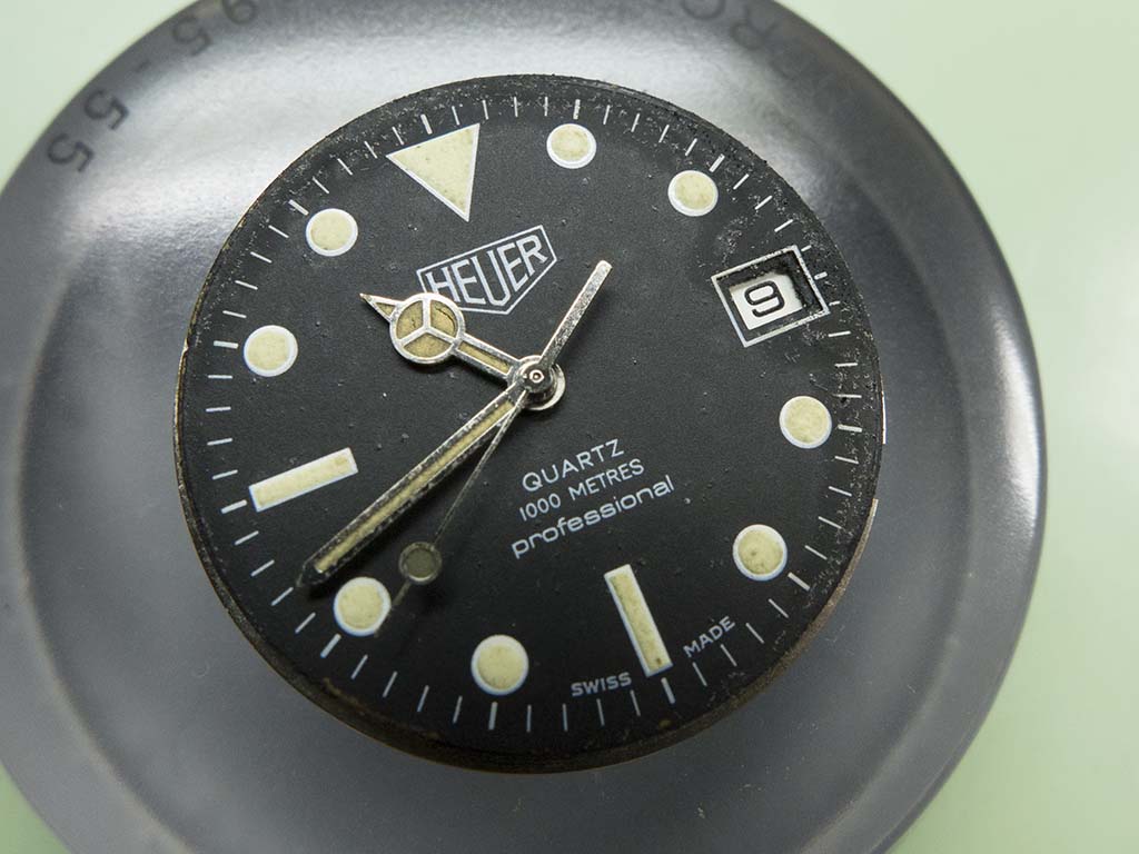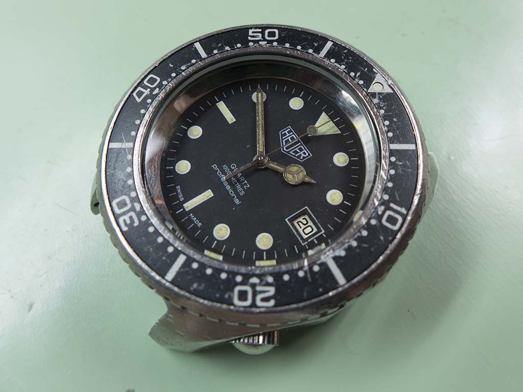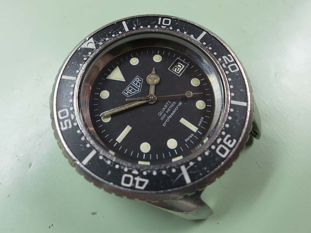 An interesting refurbishment that came in near the end of last year was this Heuer 980.023 quartz powered 1,000m divers watch. The owner remembers buying it sometime in the early eighties and did many dives with it, he also said it holds a special place in his life story and as such he would like it running again. The watch has been used hard for its intended purpose and the owner didn’t want to take any of it’s history away by reluming or replacing the dial, he wanted it to be the watch he remembered wearing on his dives. Similarly we decided to replace the crystal but apart from a thorough clean of the case not to do anything further.