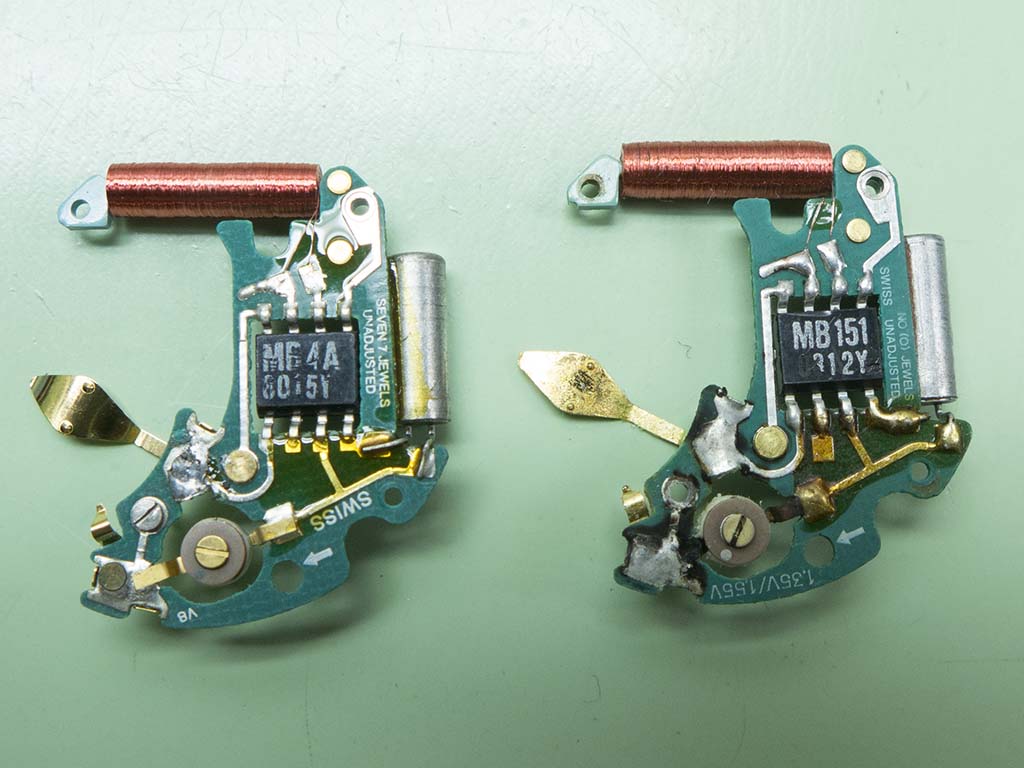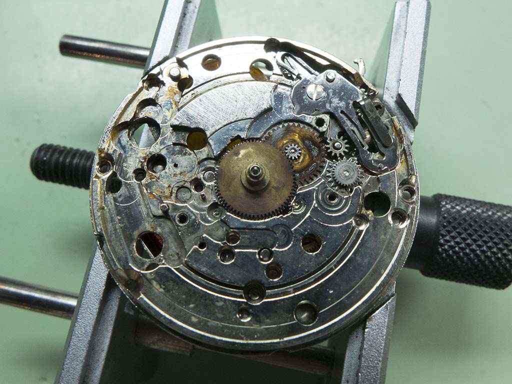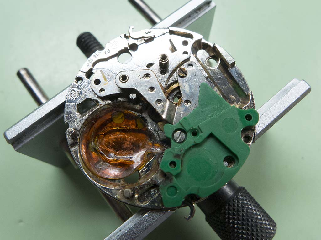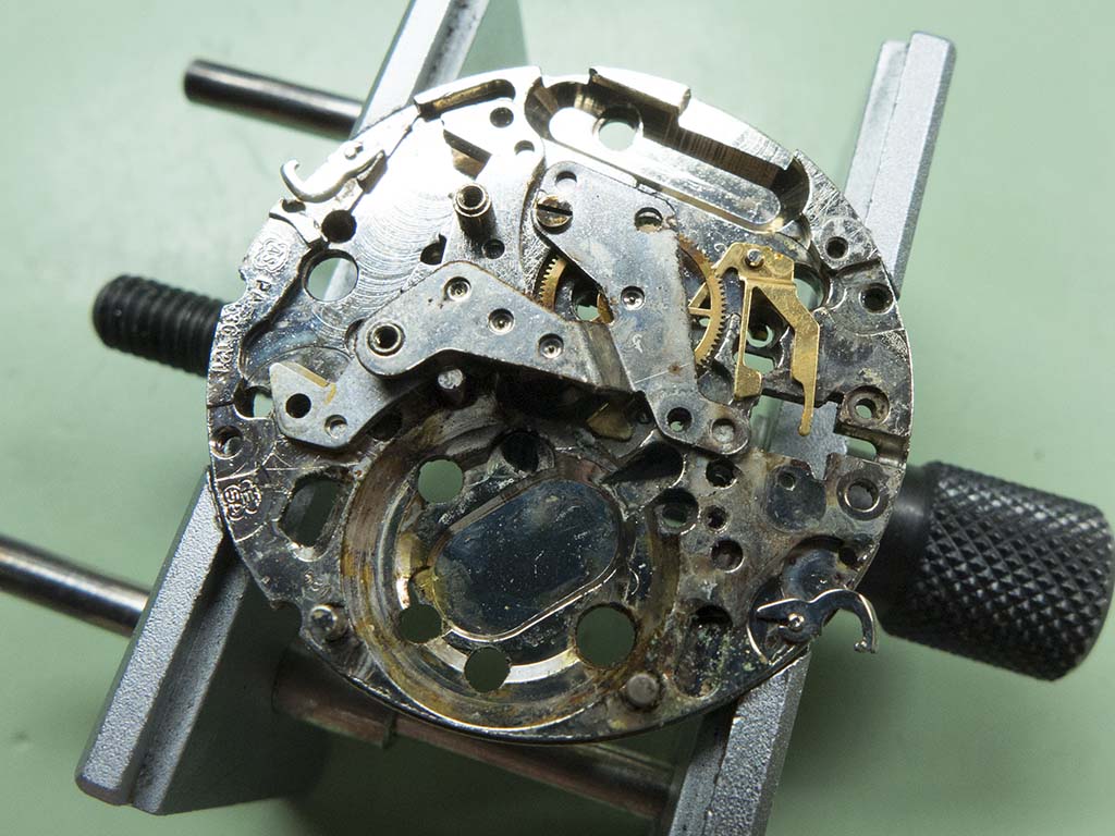 Once inside and I realised the battery was still present I feared the worse. The watch is powered by an ESA 536.121 quartz movement but there were tell tale corrosion marks on the circuit board and it looked like it had some moisture in there in the past. A quick check of the circuit and coil showed both were dead so a new one would have to be found, not the easiest things to get hold of these days!