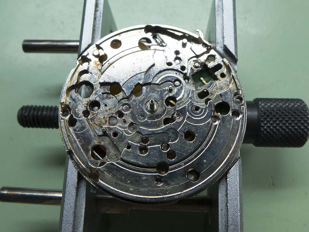 Behind the dial there was a lot more corrosion visble, some from battery fumes and some from moisture.