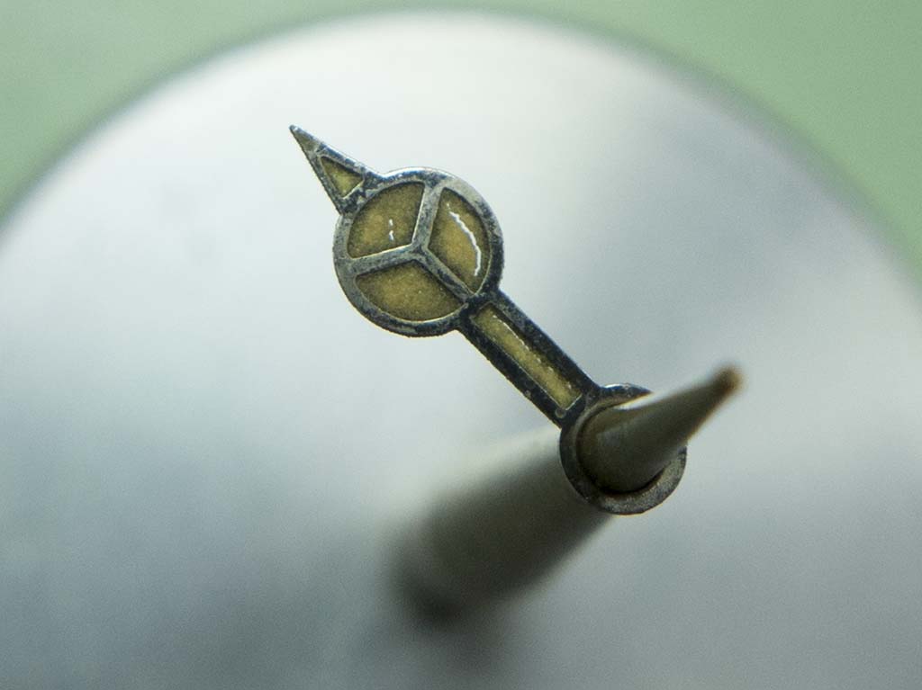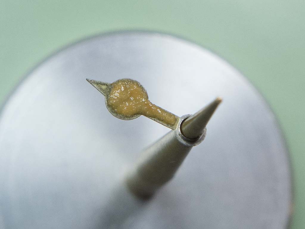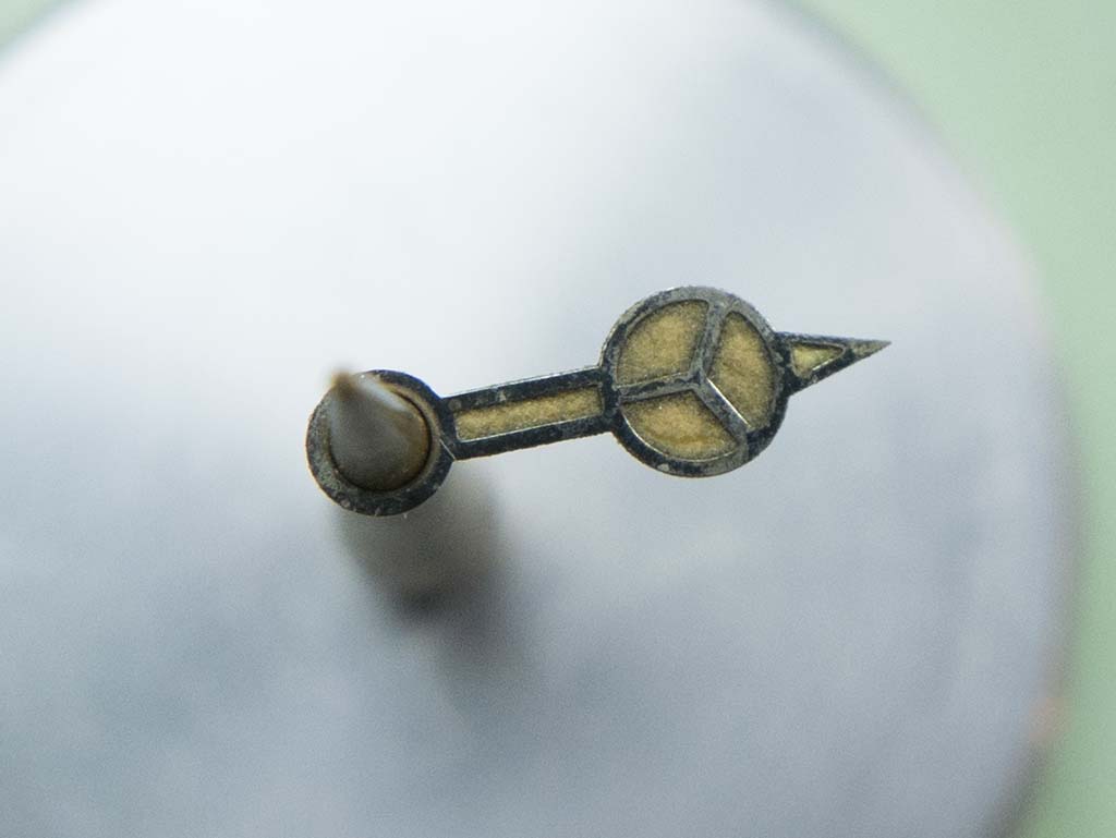 The battery fumes had affected the dial side quite vigorously with the result that the lume on the mercedes hour hand had cracked around its edge and was in danger of dropping out.