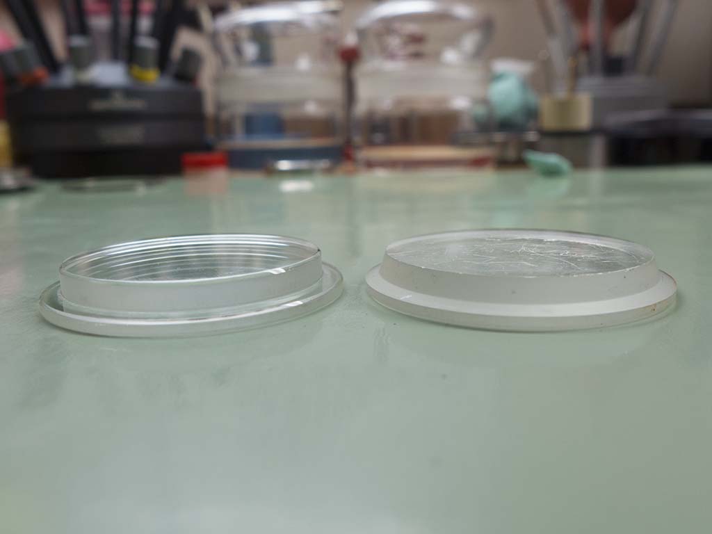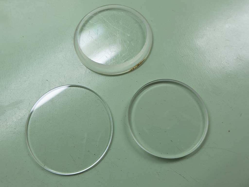 One of the problems with these 1,000m Heuers is the lack of a suitable replacement crystal, originals have long since disappeared from the parts suppliers. Because of this and the fact the owner was no longer diving I decided to make a crystal of the correct depth and diameters. Although it has the wrong profile once installed it’s not noticeable. Two crystals of the correct depth and diameter were bought…..