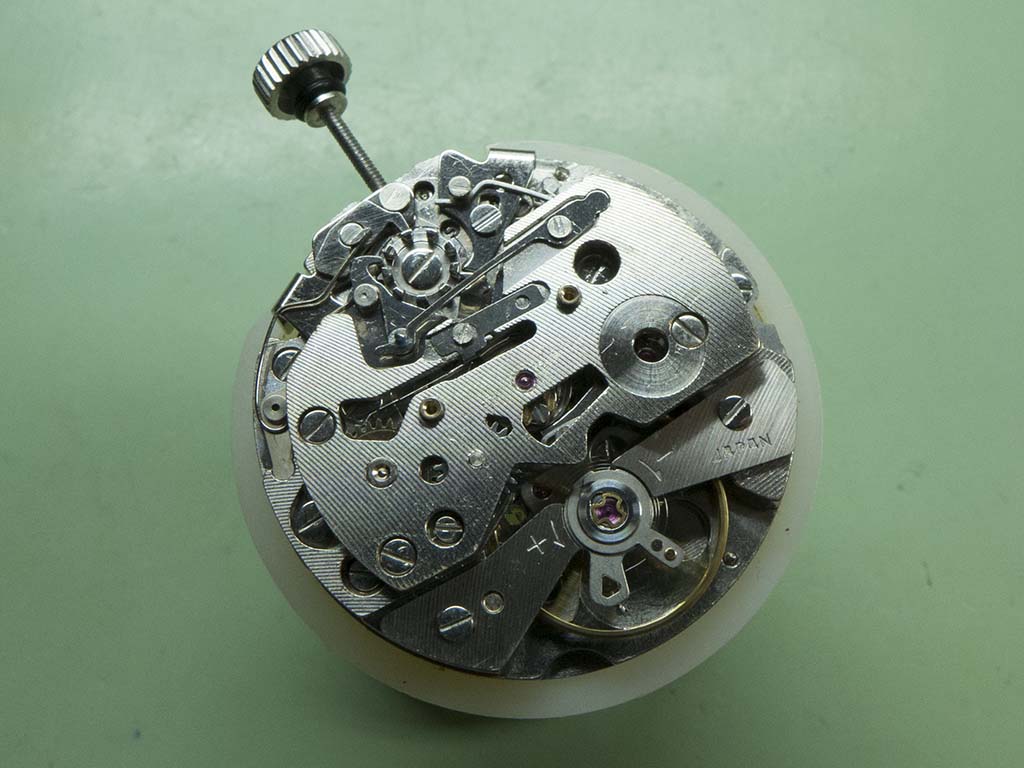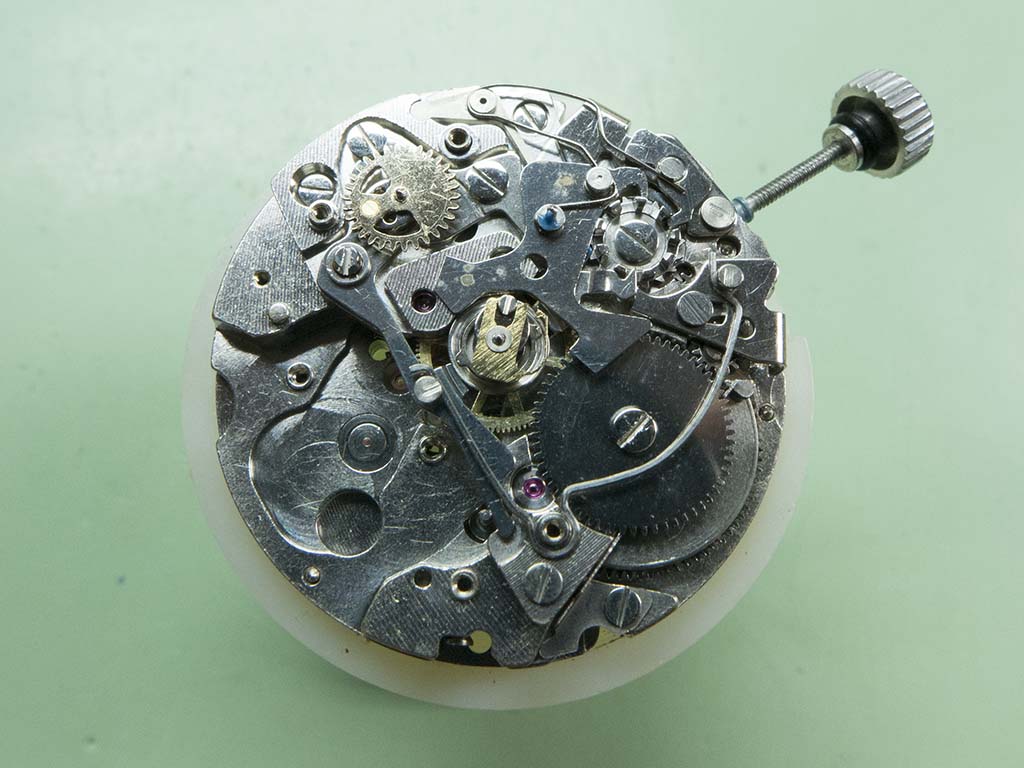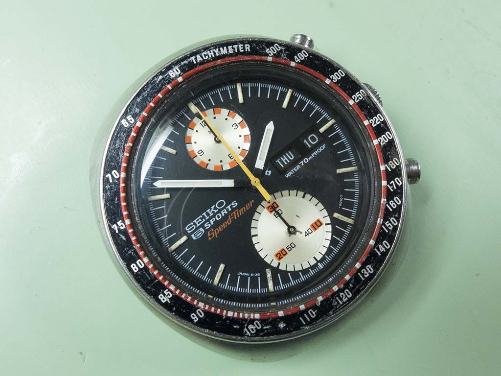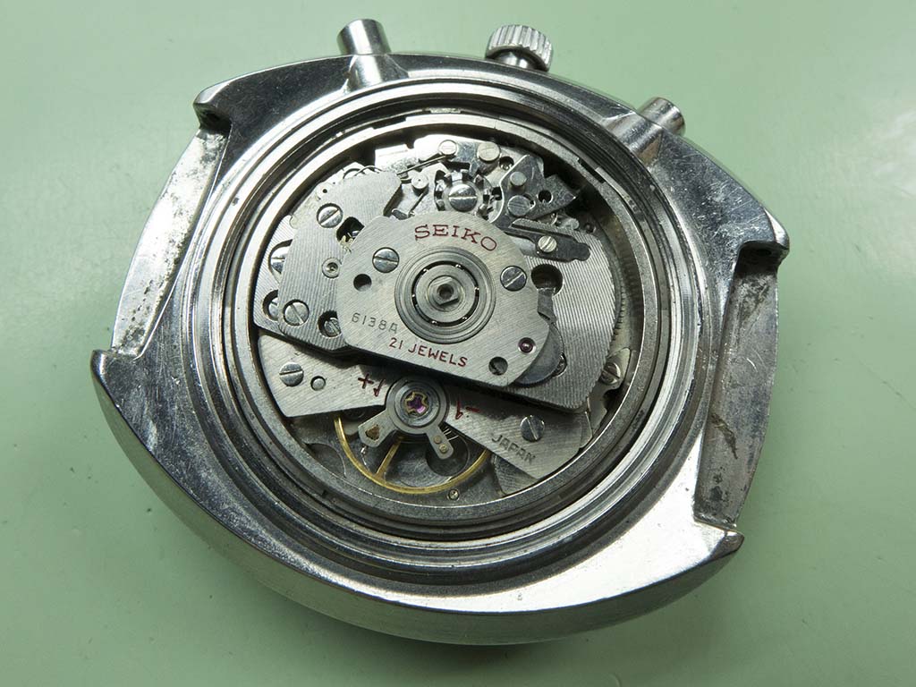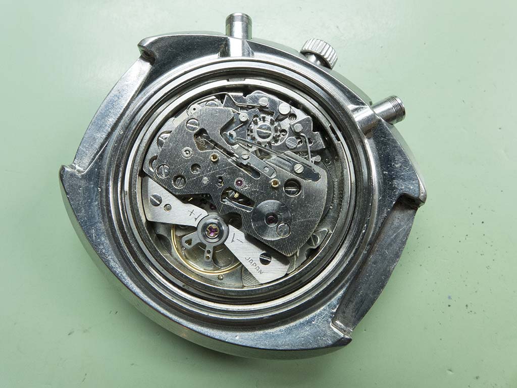 This very early Seiko 6138-0010 “UFO” came in recently for some attention. The owner had bought it in 1971 when he was working as a race mechanic for the Tyrell formula one team when they were in Japan that season. He saw it on the wrist of a Japanese mechanic working for one of the other teams and fell in love with it so a deal was struck. It was worn continuously throughout his career and he eventually ended up running his own engineering firm that produced parts for race teams. The watch was regularly serviced until a number of years ago when he was told it wasn’t possible to get the parts anymore. He took it to a couple of watchmakers in the intervening years to try and get it resurrected but ultimately all that happened was it was returned not working with some parts missing! Having sold his company and taking life a little easier his thoughts came back to getting the watch repaired and this is where I come in.