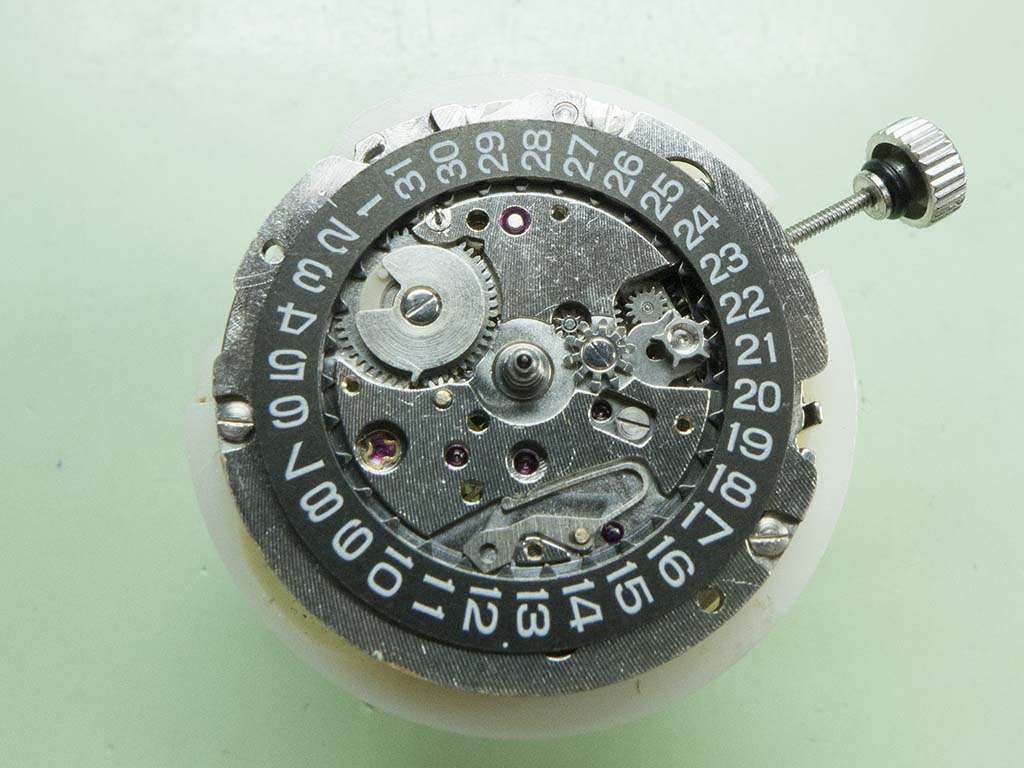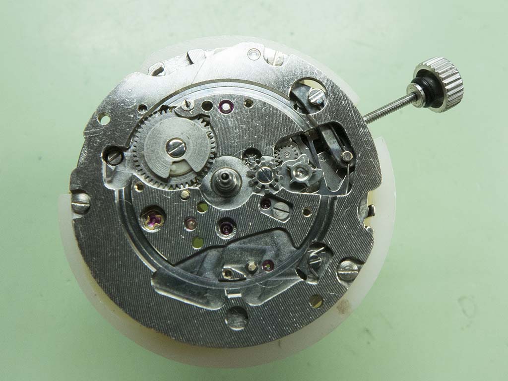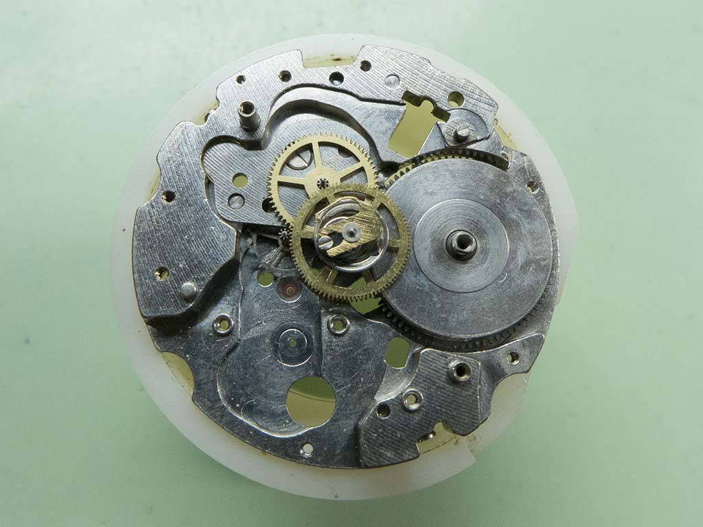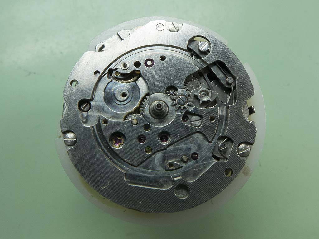 Because it’s an early model the date driving wheel is metal not plastic, as is the intermediate date driving wheel. The date change finger is still plastic though.
