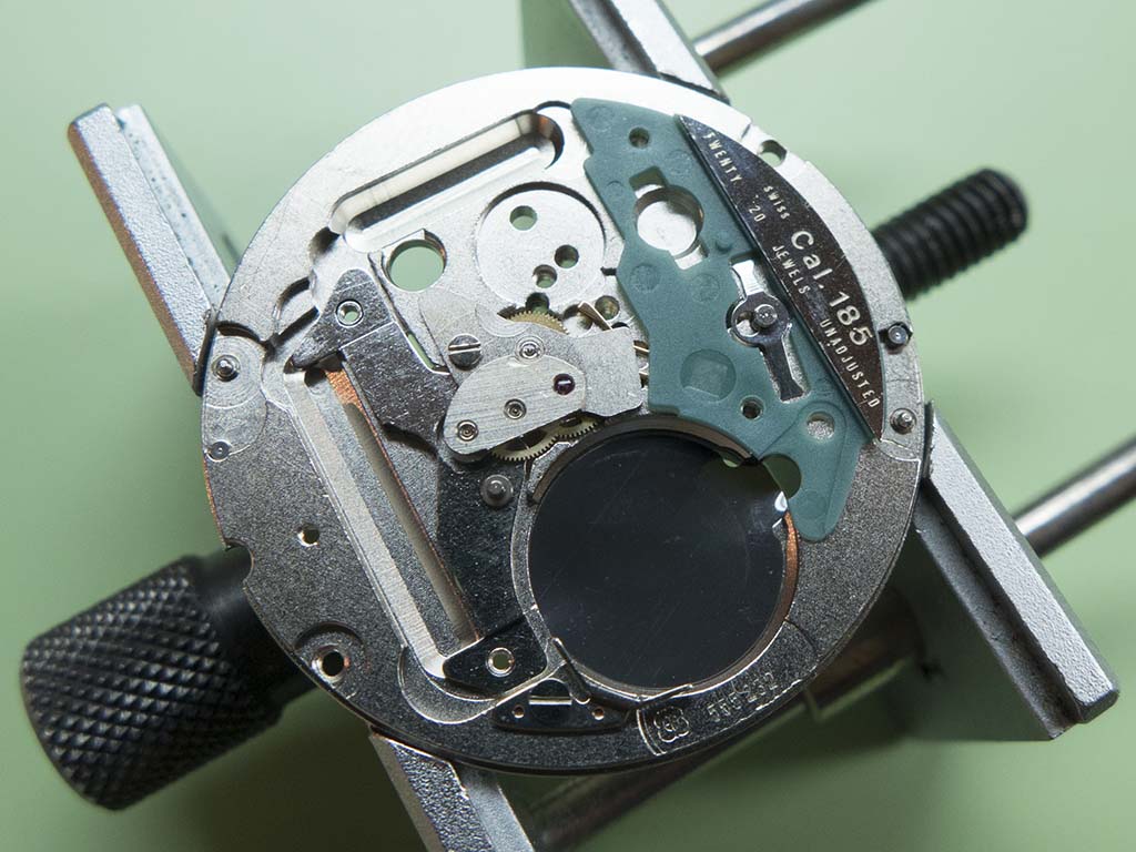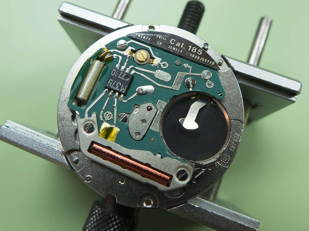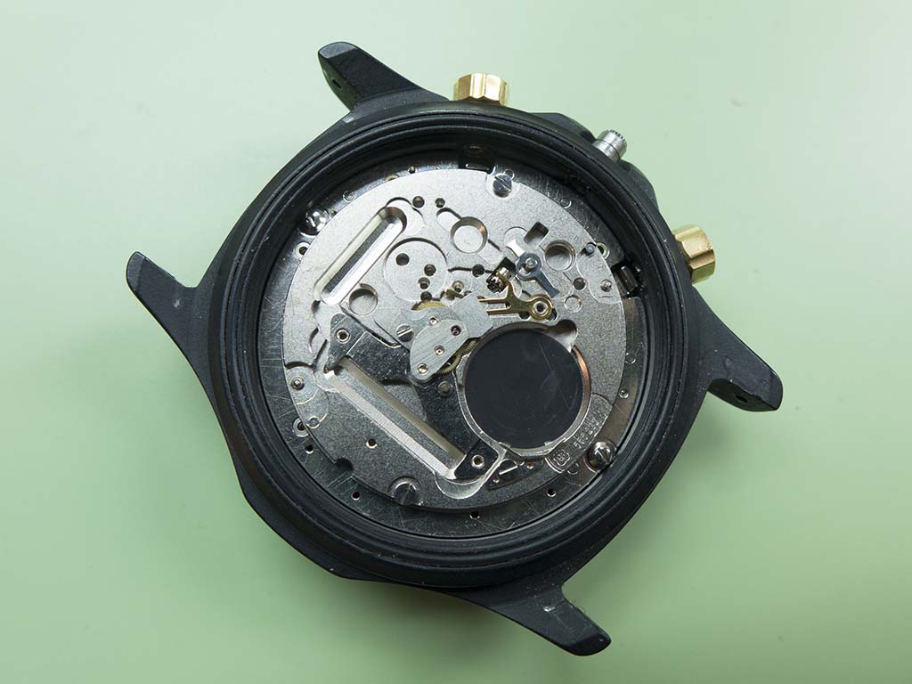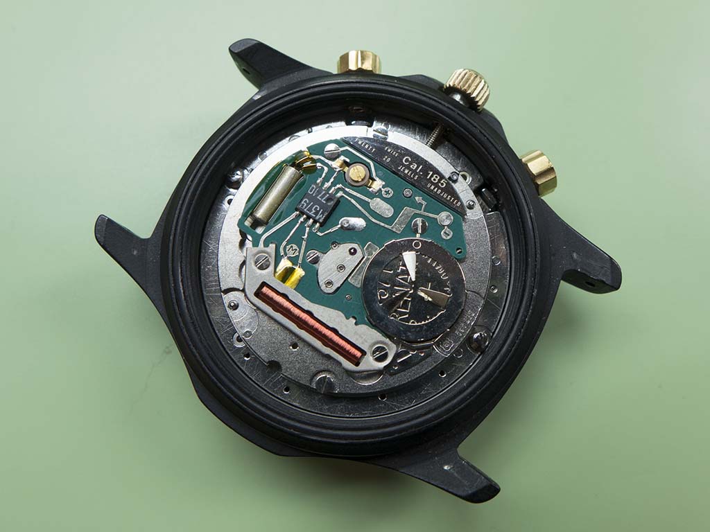 With the caseback off you can see the typical ETA quartz architecture although there’s a little plate that informs us it’s actually a Heuer calibre 185 🙂