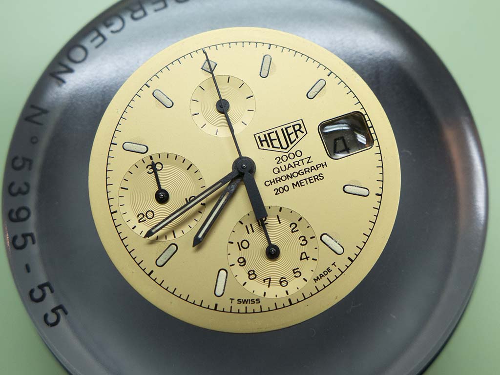 This Heuer 2000 quartz chronograph came in recently for a service, the watch ran with the chronograph running but spluttered to a halt with it disengaged. This particular Heuer is a modular chronograph meaning the movement powers a separate chronograph module fixed on where the dial would usually sit. Modular chrono’s are usually easily identifiable by the crown being below the line of the pushers. This one is powered by a slightly modified ETA 555.282 quartz movement and the chronograph module is a Dubios-Depraz 2000, these find their way into quite a number of manufacturers chronograph models.