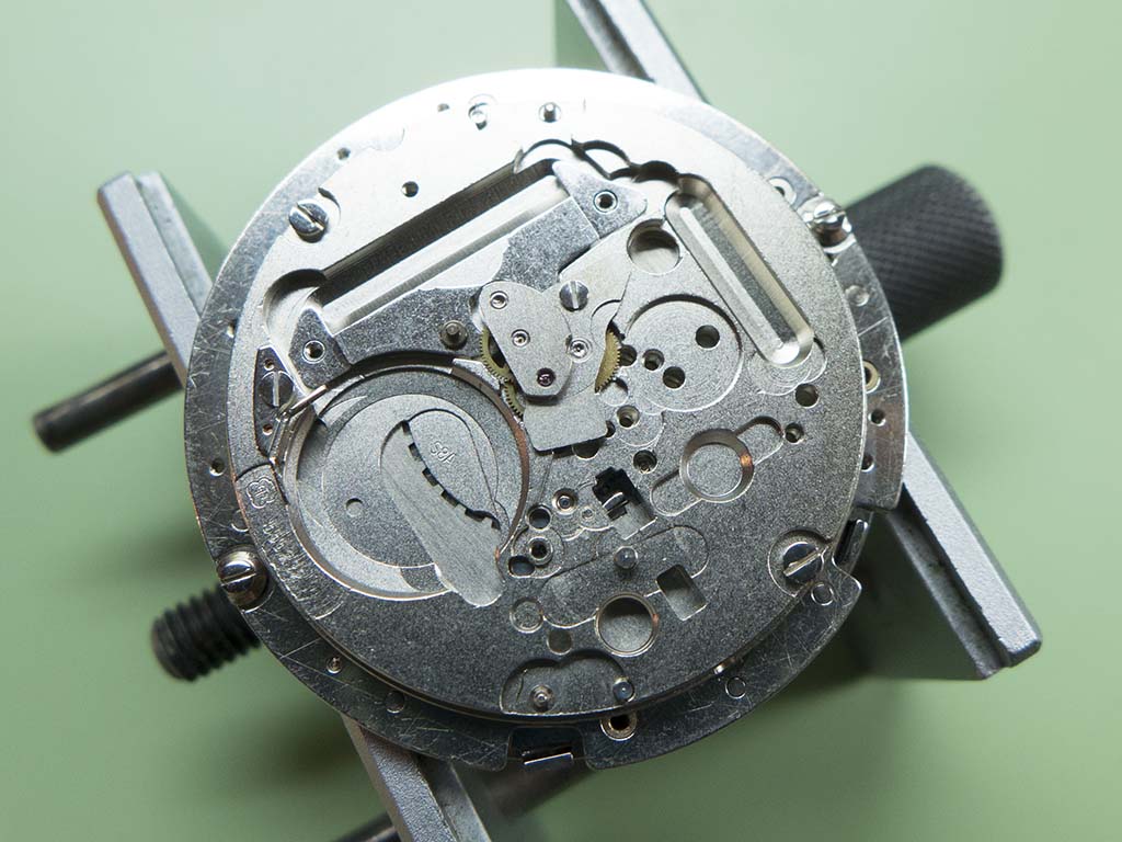 I can now flip the assembly over and unscrew the movement from the module, it’s secured with two screws.