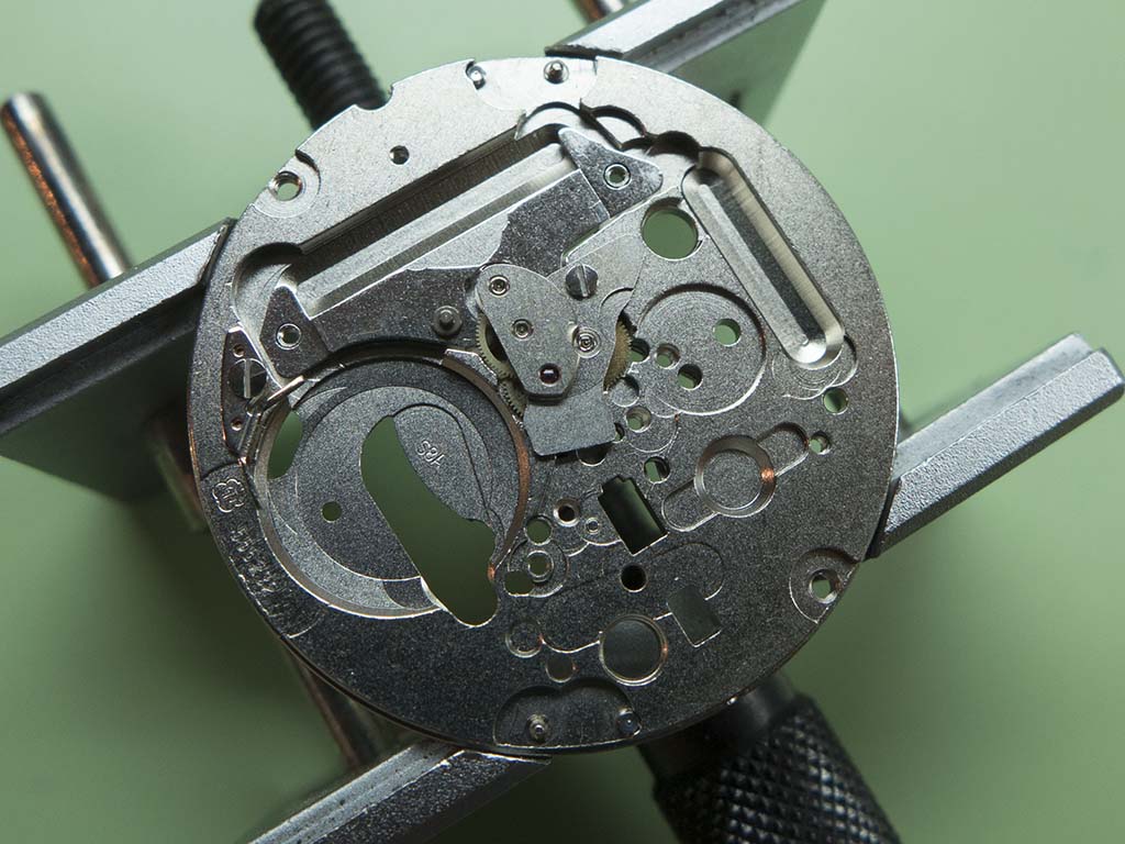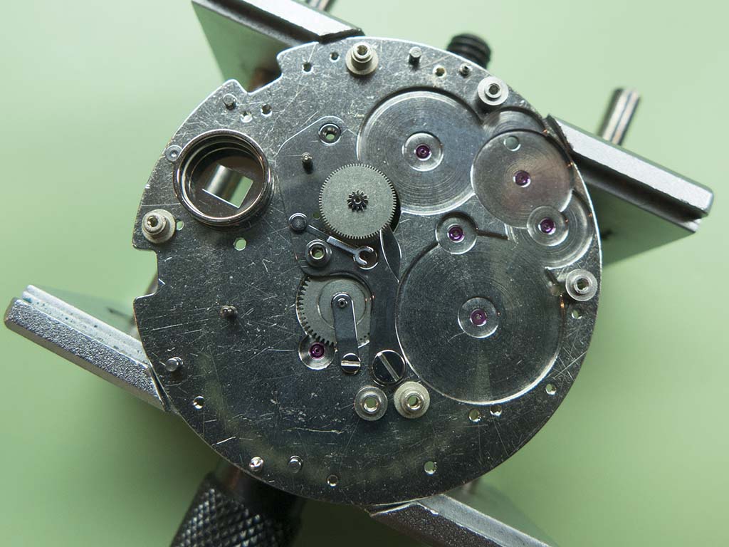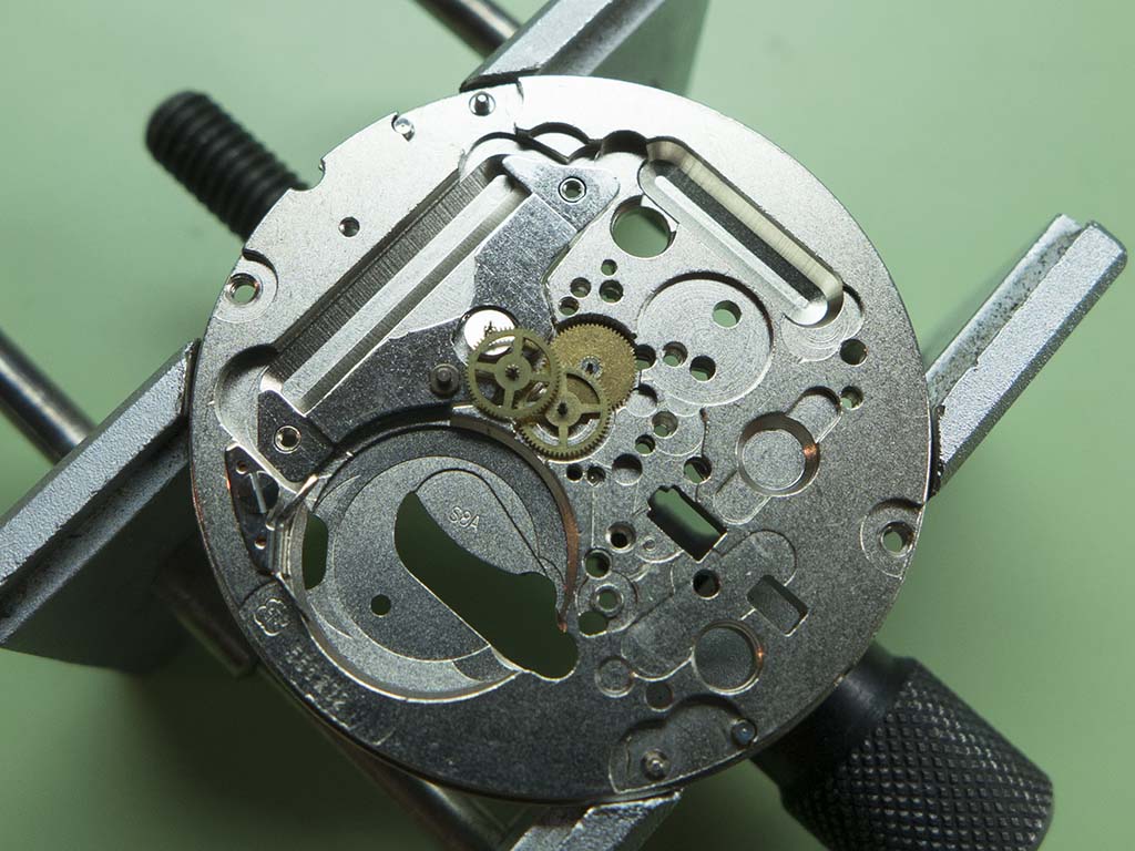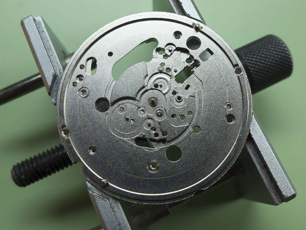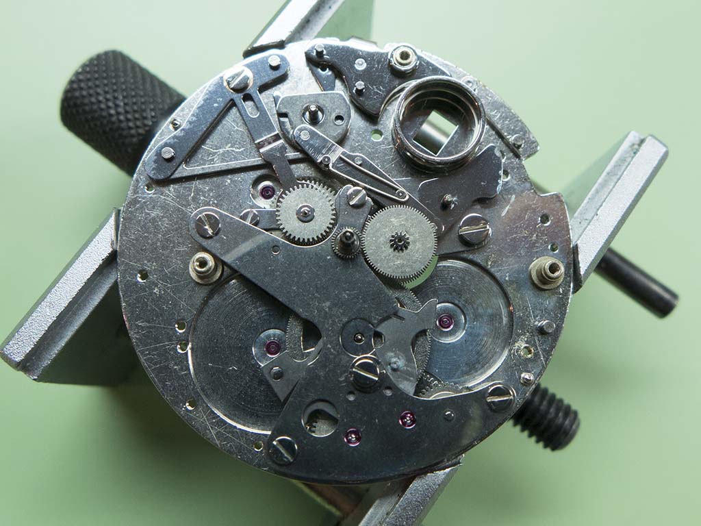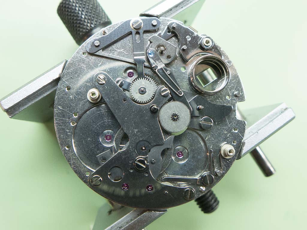 With it now seperated I can fully strip the ETA 555.282 movement. You can see the modification in this shot, the seconds pinion is shortened and has a gear to drive the chrono module, the hour wheel has pinion leaves where the hour hand would normally fit which drives the motion work in the module.