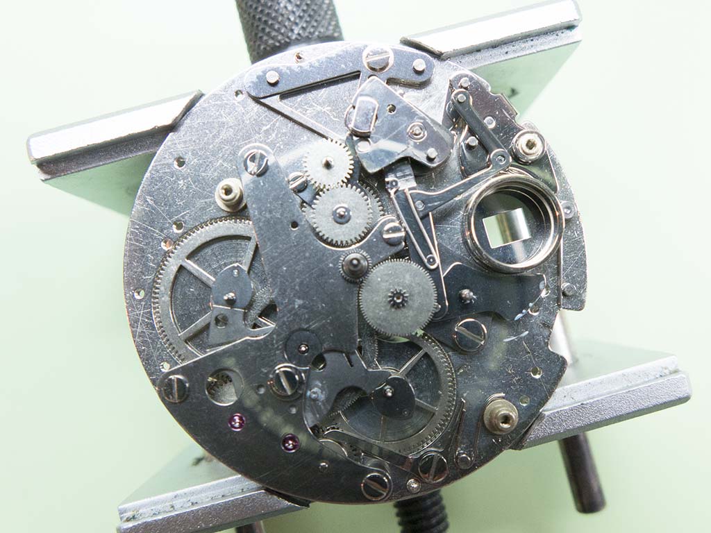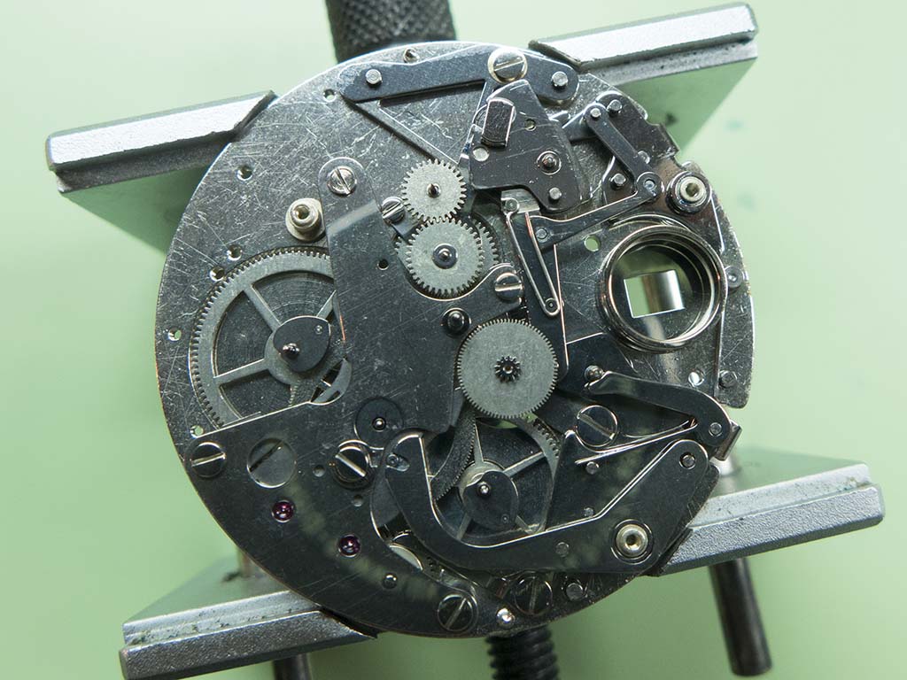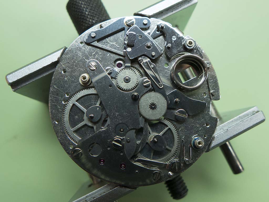 With the top plate removed you can see the complex start/stop lever work with the more traditional reset lever work at the bottom of the shot.
