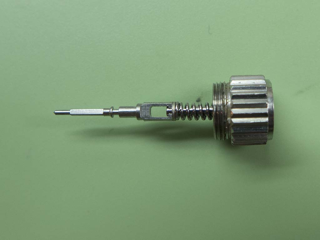 The re-staffed balance and cock was fitted and the watch was put on the timing machine. It started out ok but then the amplitude would suddenly drop to about 100 degrees for no apparent reason. After a while it would jump back up and stay there, then it would drop again. I knew exactly what was happening having been through this in the past, the balance staff was slipping in the balance wheel. The brass of the wheel is very fragile and it doesn’t take much for it to be minutely damaged or fatigued when the old staff is removed, this meant that when the replacement staff was fitted it wasn’t gripping correctly. It’s futile persevering with trying to tighten it up, I’ve wasted hours in the past trying to rectify this problem to no avail.
