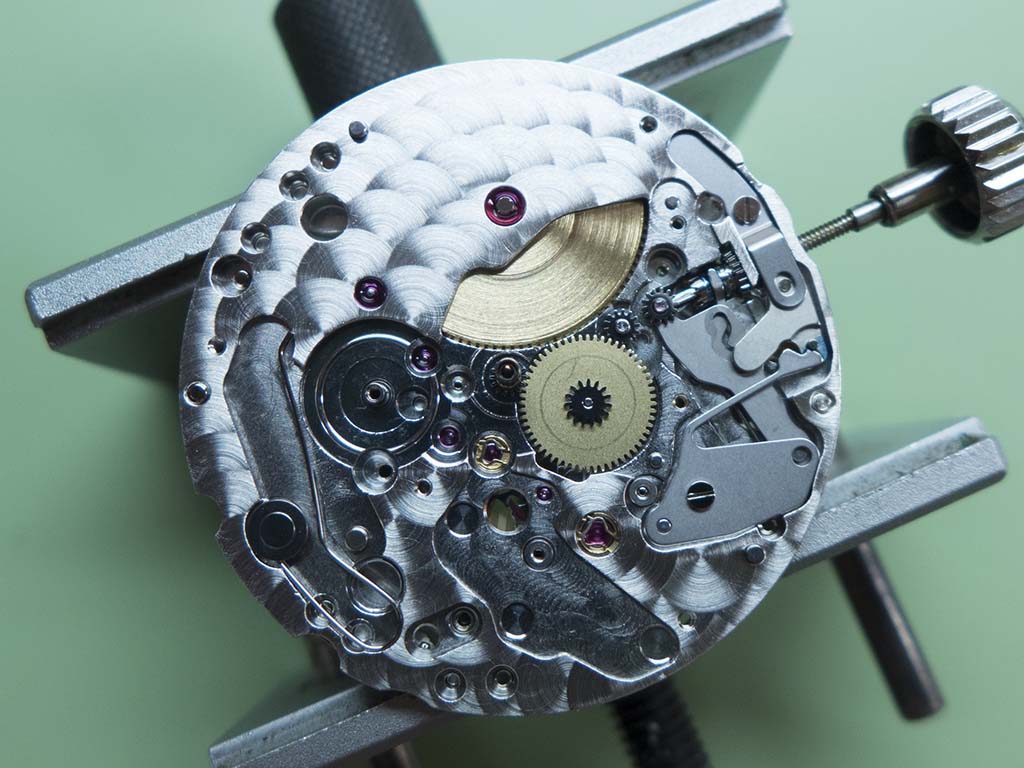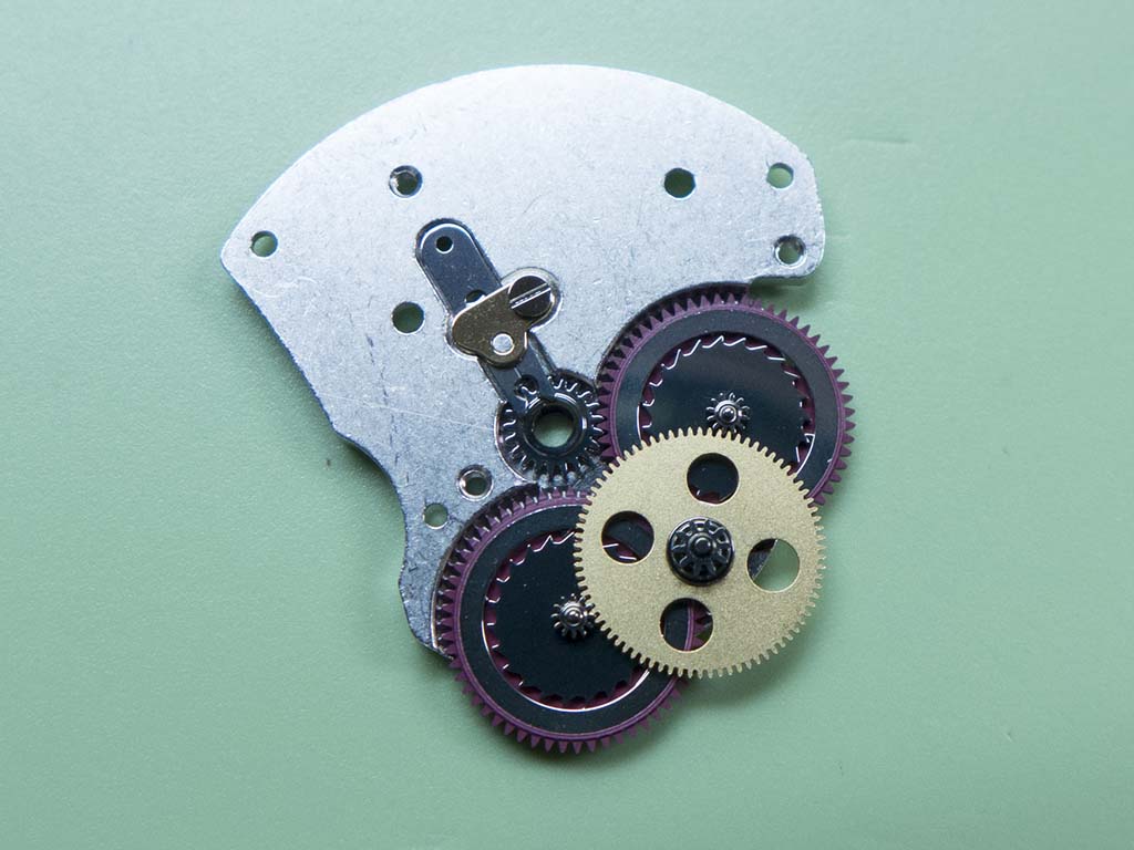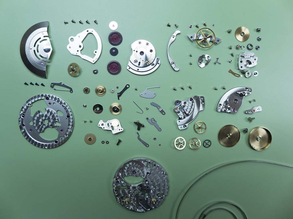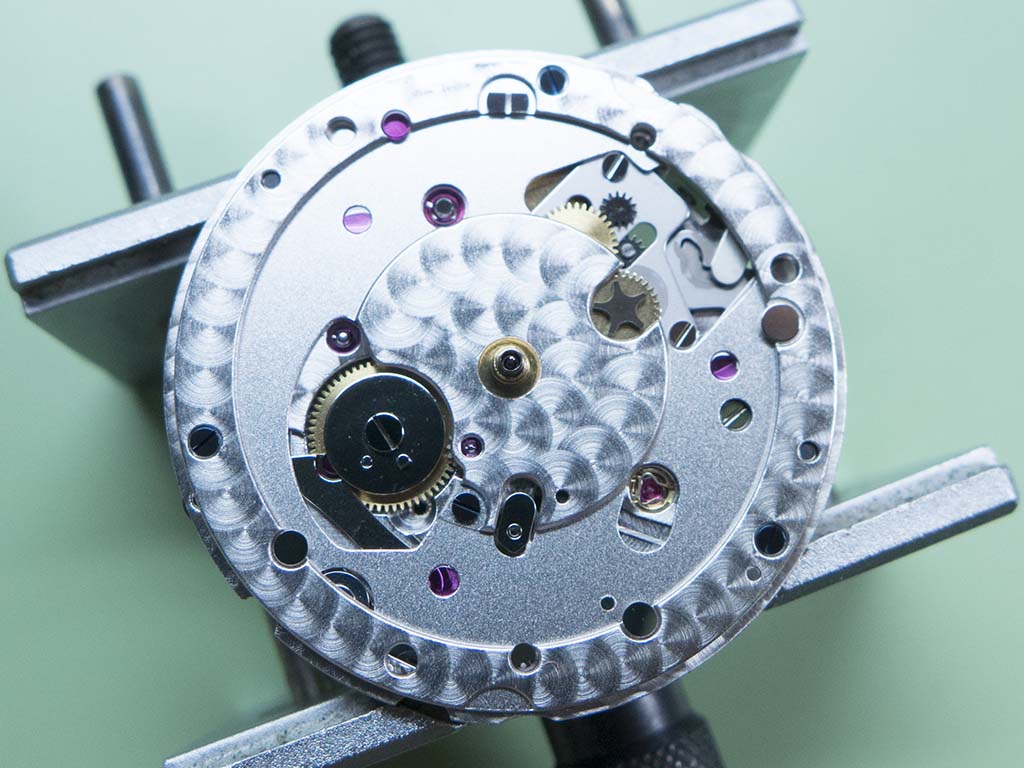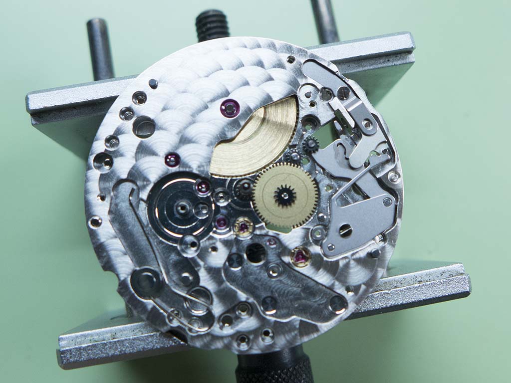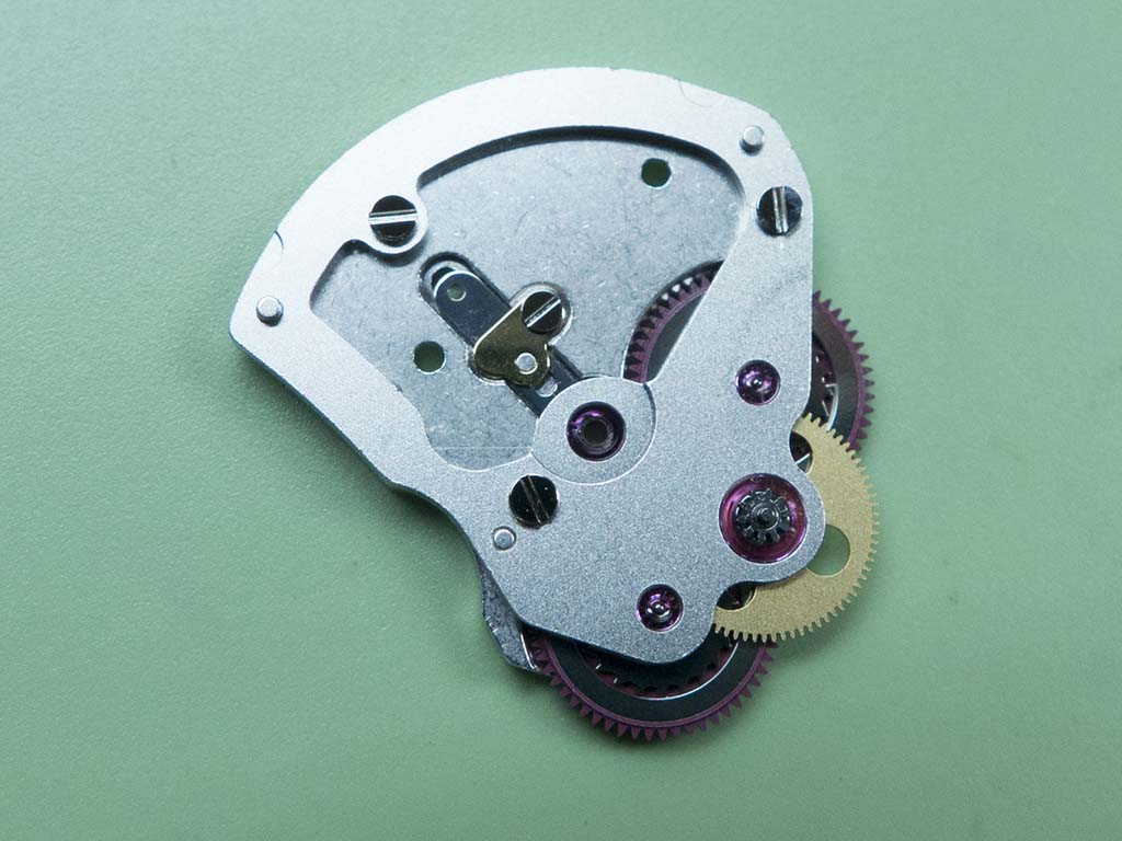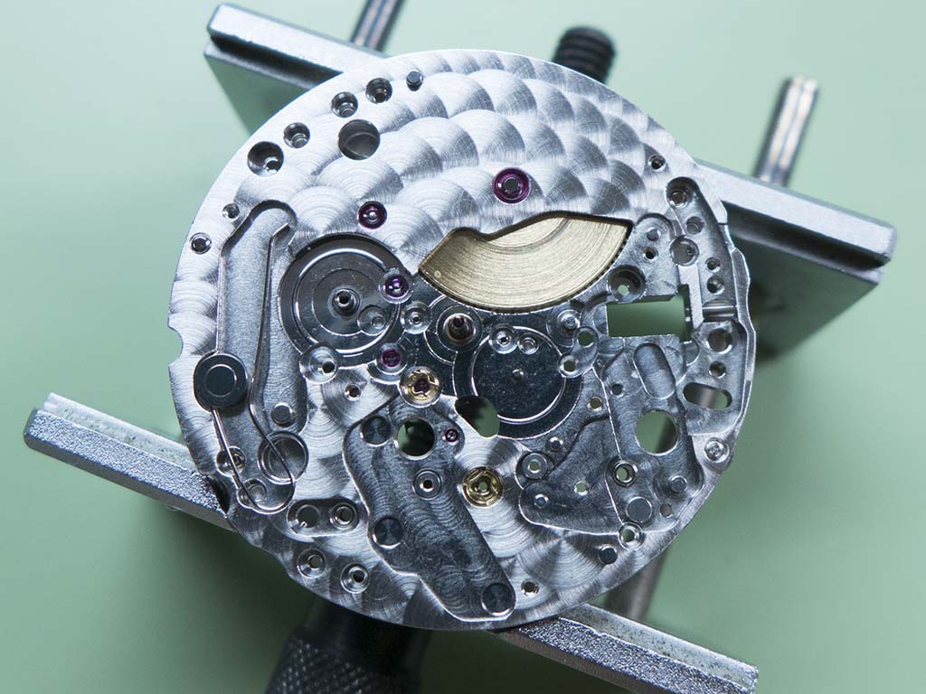 The first thing to be taken off is the oscillating weight, then the automatic framework with its distinctive purple reverser wheels can be removed.