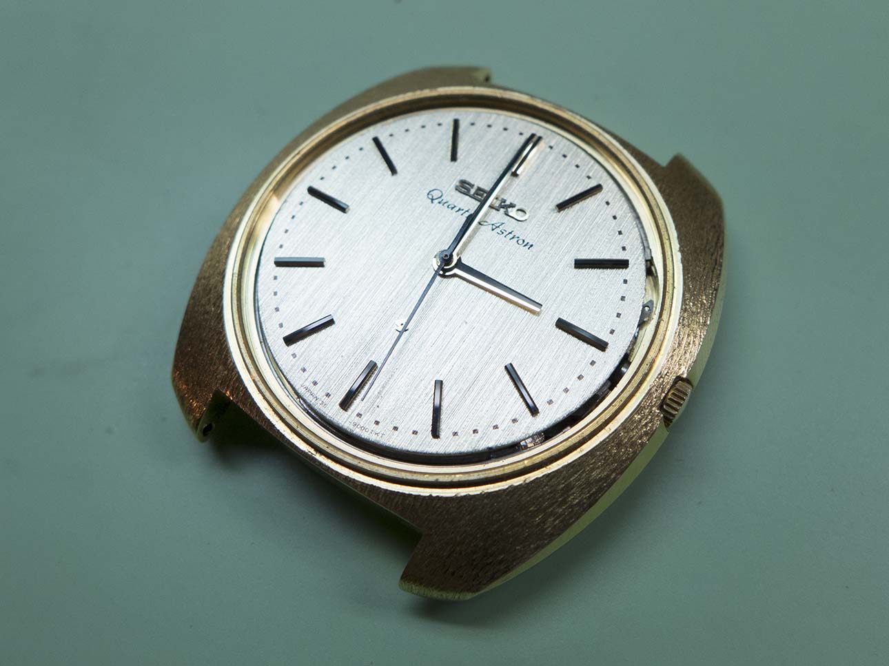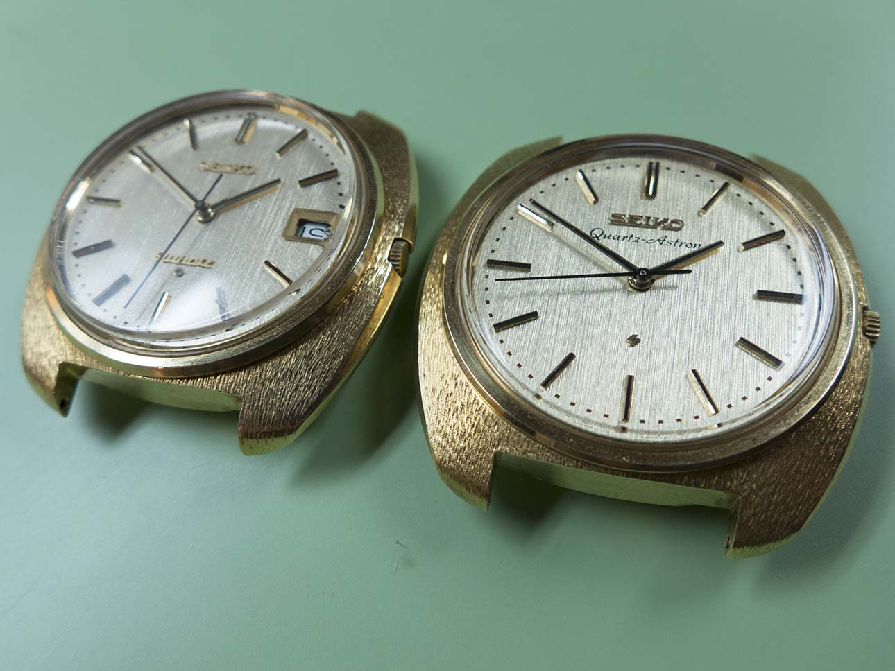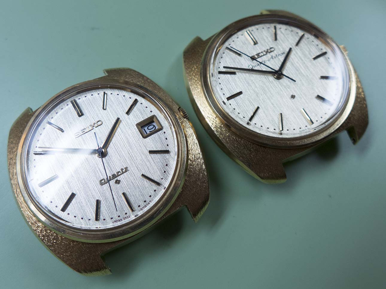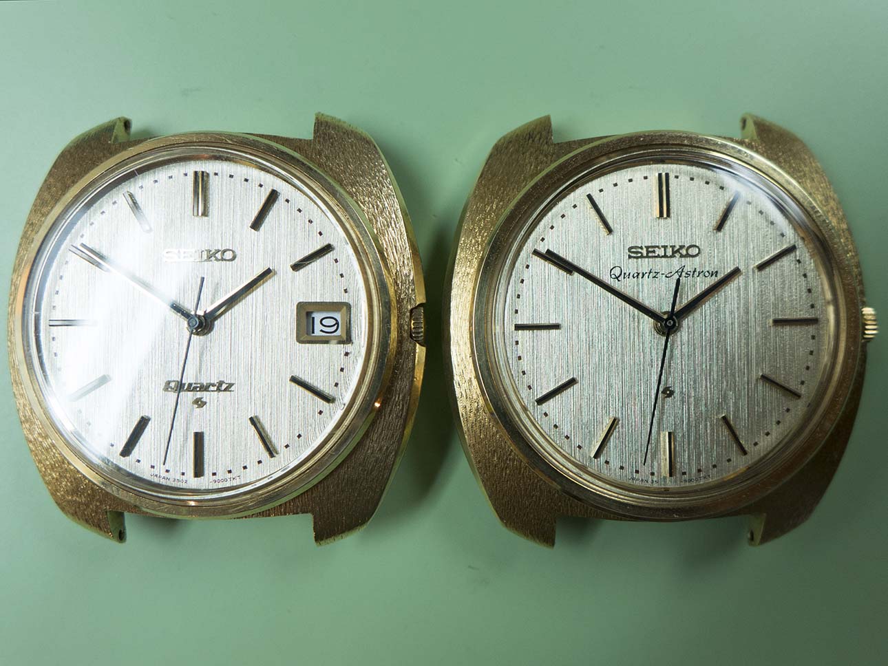 I know updates have taken a back seat this year solely due to the volume of work that keeps coming in but I couldn’t let this pair pass by without a post about them. As most people with an interest in horological history will know, the world’s first quartz wristwatch was introduced on Dec 25th 1969 by Seiko. Called the “Astron” it was powered by Seiko’s 35a quartz movement which had been 10 years in development and was truly a revolution in wristwatch manufacture, in fact the quartz movement changed the face of wristwatch production forever and caused years of change and lets face it some very hard times for watch manufacturers around the rest of the world. The 35a movement’s frequency was 8192 Hz, a quarter of the frequency of quartz oscillators today although the accuracy was still an impressive ±0.2 seconds per day or ±5 seconds per month. One of the major features was its hybrid integrated circuit innovation which consumed far less power than transistors of the time. Another breakthrough was the step motion seconds hand made possible by developing a miniature open step motor, this innovation was adopted by other manufactures of quartz watches later on. This was only possible because Seiko did not pursue monopolization on patent rights of those unique technologies and opened them up to all the world. At the time of release the Astron cost 450,000 yen ($1,250) which at the time was equivalent to the price of a medium-sized car. Even at this high price after the first week Seiko had sold 100 units. The case was made from 18k gold and had a distinctive textured finish, the dial also had a textured finish and the hands were of the simple baton/stick type.