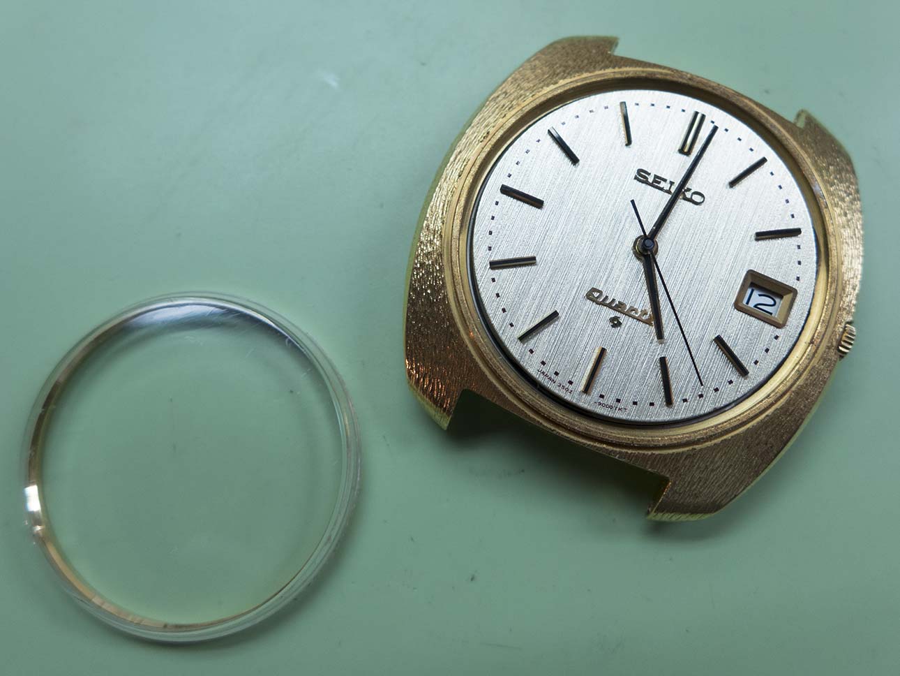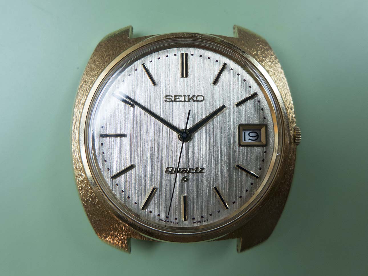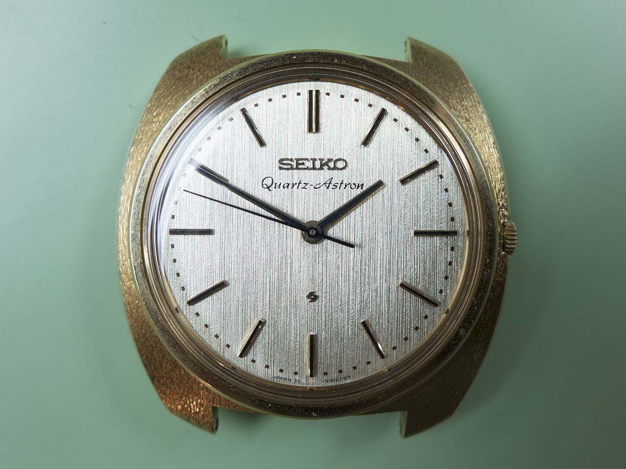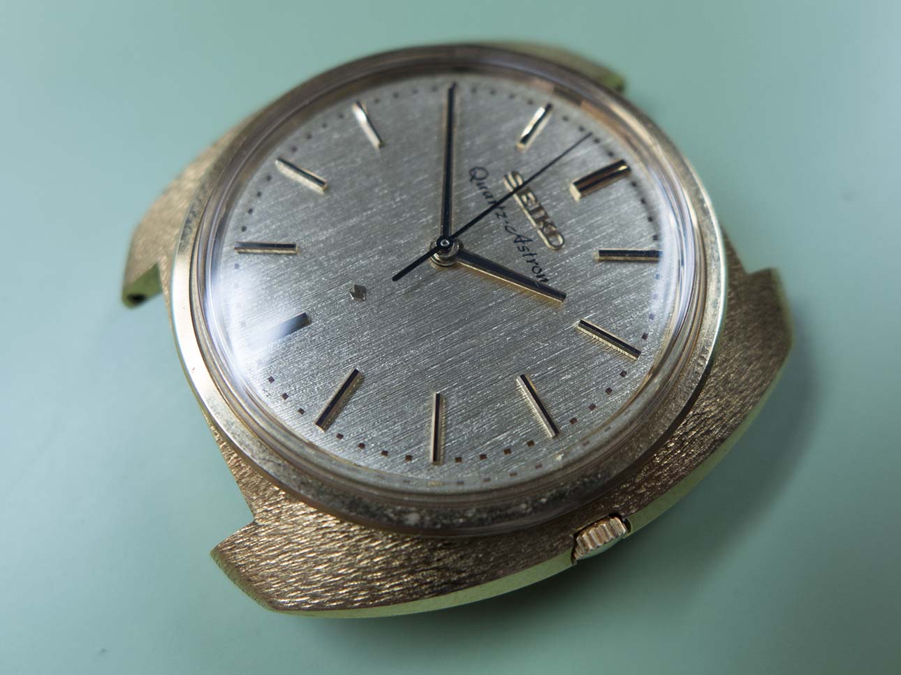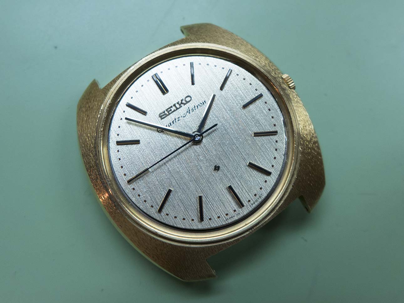 I know updates have taken a back seat this year solely due to the volume of work that keeps coming in but I couldn’t let this pair pass by without a post about them. As most people with an interest in horological history will know, the world’s first quartz wristwatch was introduced on Dec 25th 1969 by Seiko. Called the “Astron” it was powered by Seiko’s 35a quartz movement which had been 10 years in development and was truly a revolution in wristwatch manufacture, in fact the quartz movement changed the face of wristwatch production forever and caused years of change and lets face it some very hard times for watch manufacturers around the rest of the world. The 35a movement’s frequency was 8192 Hz, a quarter of the frequency of quartz oscillators today although the accuracy was still an impressive ±0.2 seconds per day or ±5 seconds per month. One of the major features was its hybrid integrated circuit innovation which consumed far less power than transistors of the time. Another breakthrough was the step motion seconds hand made possible by developing a miniature open step motor, this innovation was adopted by other manufactures of quartz watches later on. This was only possible because Seiko did not pursue monopolization on patent rights of those unique technologies and opened them up to all the world. At the time of release the Astron cost 450,000 yen ($1,250) which at the time was equivalent to the price of a medium-sized car. Even at this high price after the first week Seiko had sold 100 units. The case was made from 18k gold and had a distinctive textured finish, the dial also had a textured finish and the hands were of the simple baton/stick type.