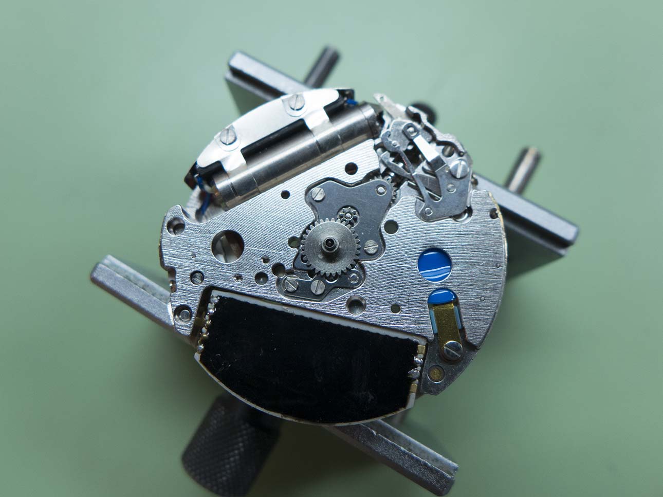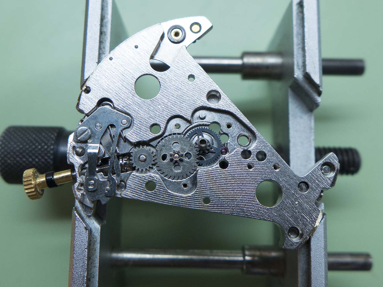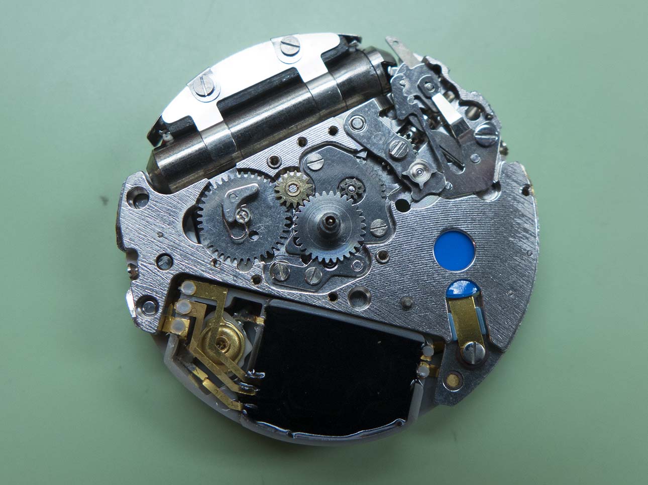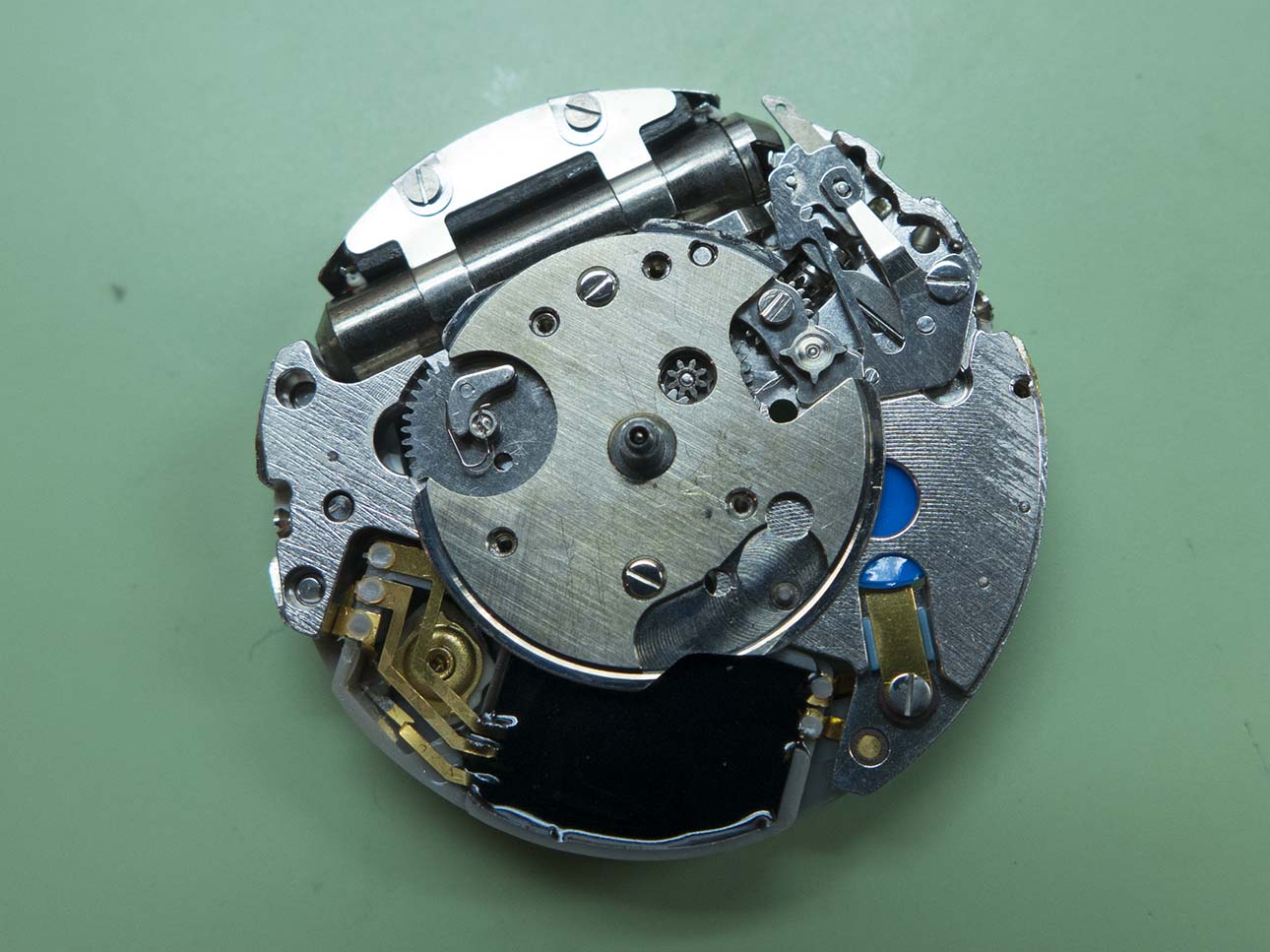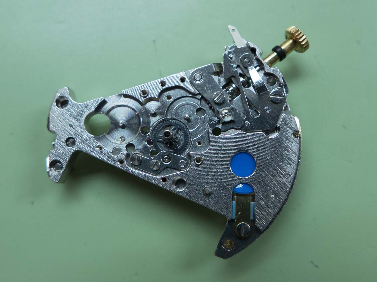 The bridge is removed in this shot, not the different shaped stop lever which acts on the centre wheel instead of the step motor.
