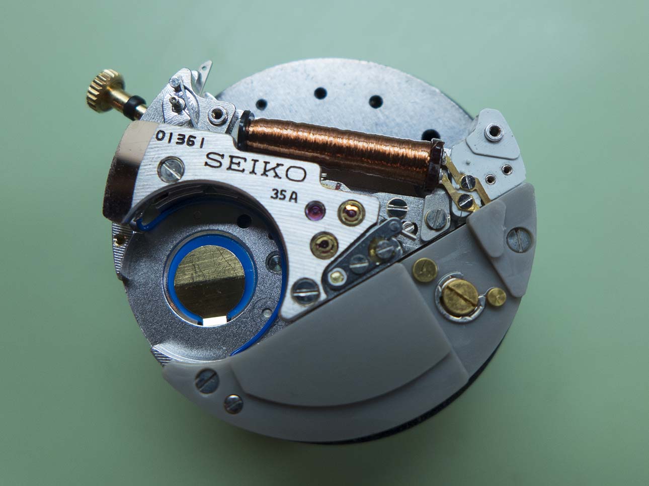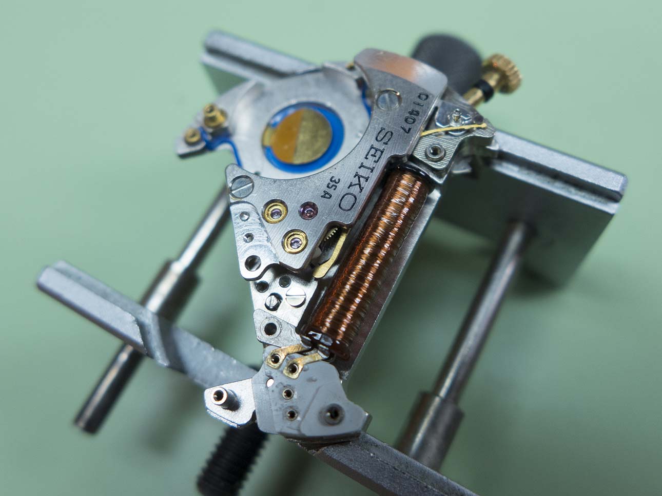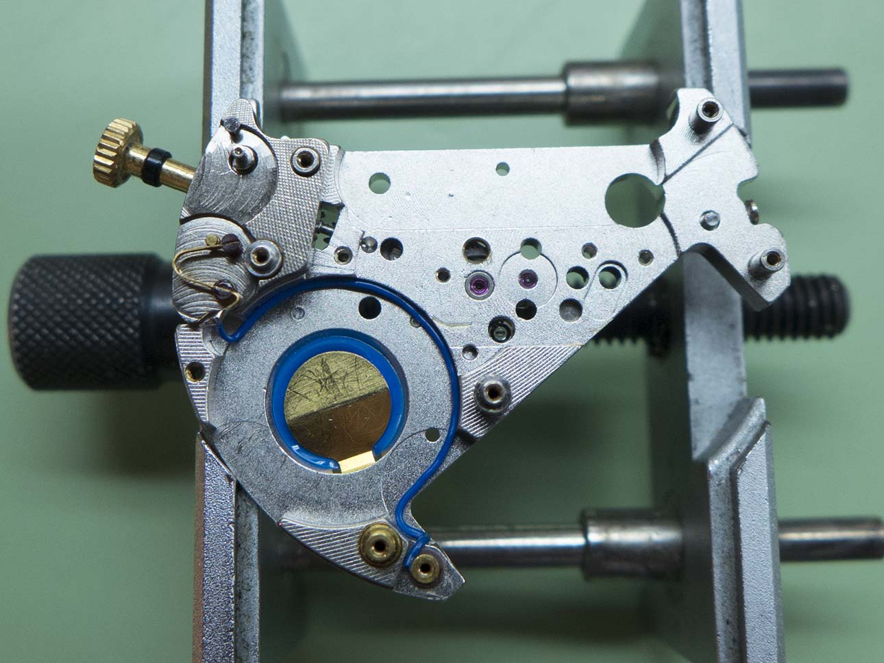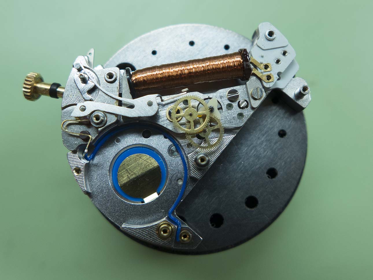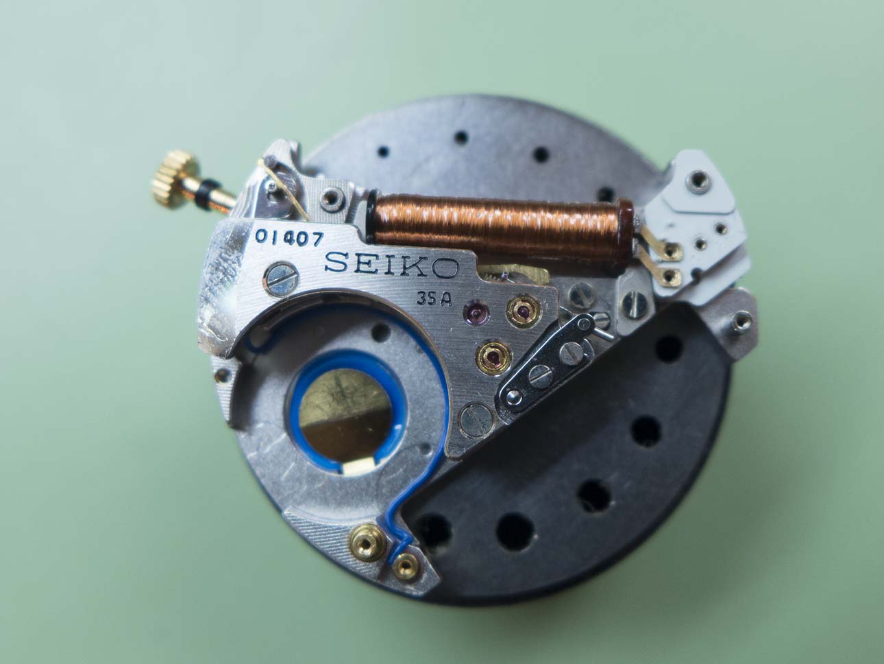 The bridge is removed in this shot, not the different shaped stop lever which acts on the centre wheel instead of the step motor.