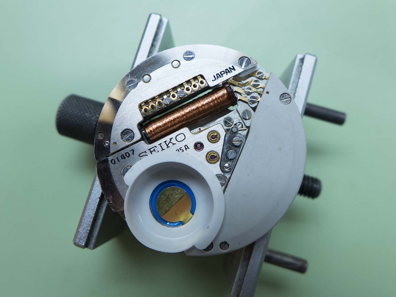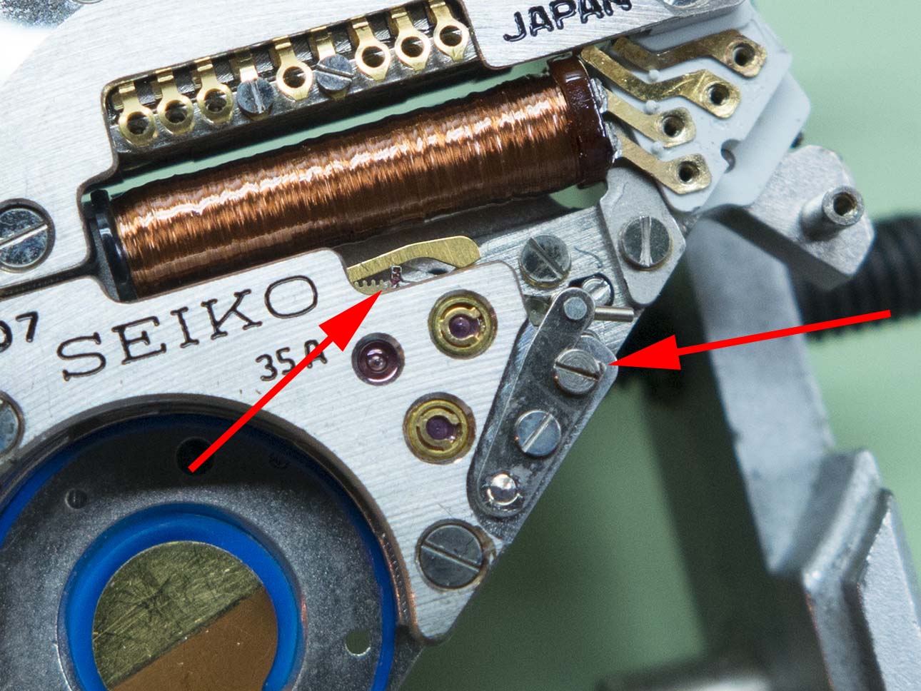 A feature you don’t see on todays quartz’s is a jewelled jumper to index the centre wheel, Seiko obviously didn’t want to rely on the step motor alone. A benefit of this is the seconds hand will alway land bang on it’s marker when lined up correctly on re-assembly! The pressure on the centre wheel can be increased or decreased by turning the eccentric screw (arrowed on the right).