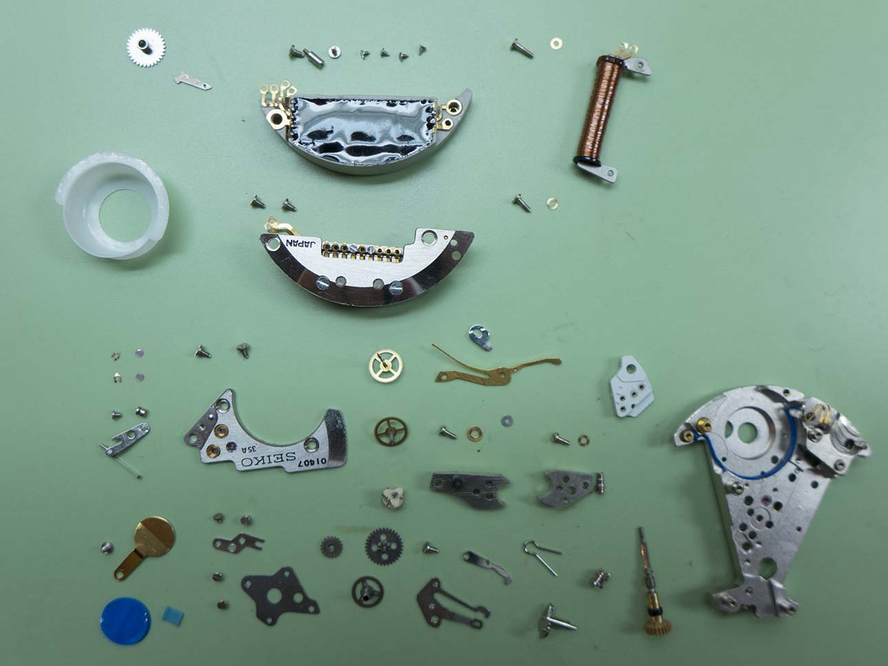 With the dial removed you can see the mainplate is shaped like a wedge of cheese to allow for the huge (by today’s standards) quartz oscillator and circuit block. The motion and keyless work are both a simple affair, although all the parts are pretty much unique to this calibre.