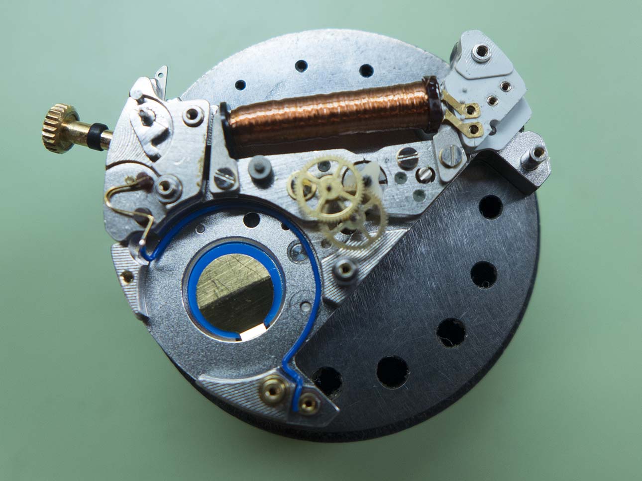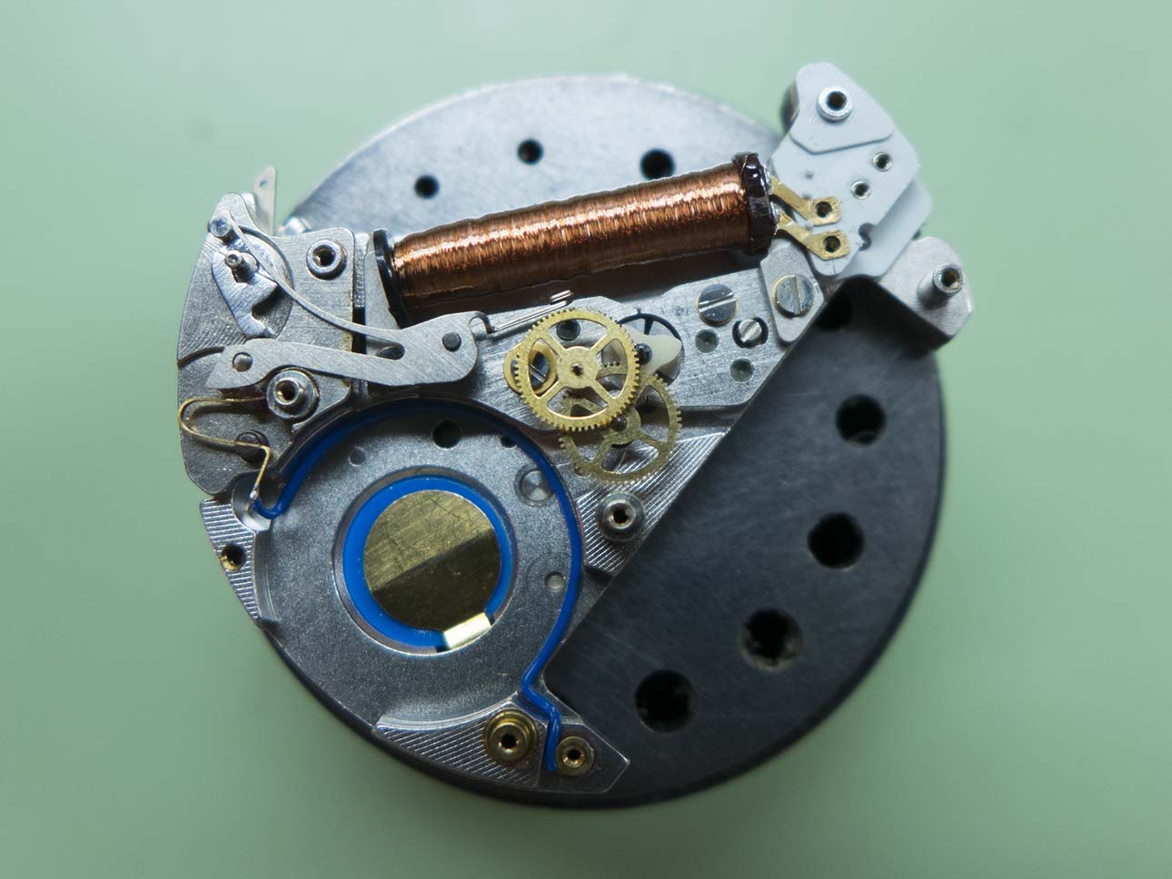 I’d refitted the circuit and quartz oscillator here. Despite cleaning all the contacts (which to be fair looked in good condition anyway) and servicing the mechanics, the current draw remained steady at 3.46µA. This was exactly what it was before I started, as mentioned the coil was healthy with a reading of 3.07kΩ. These are power hungry movements which draw about 7µA when running and this drops to about 2.5µA when hacked. The issue was obviously deeper seated than hoped for which means replacement parts will be required.
