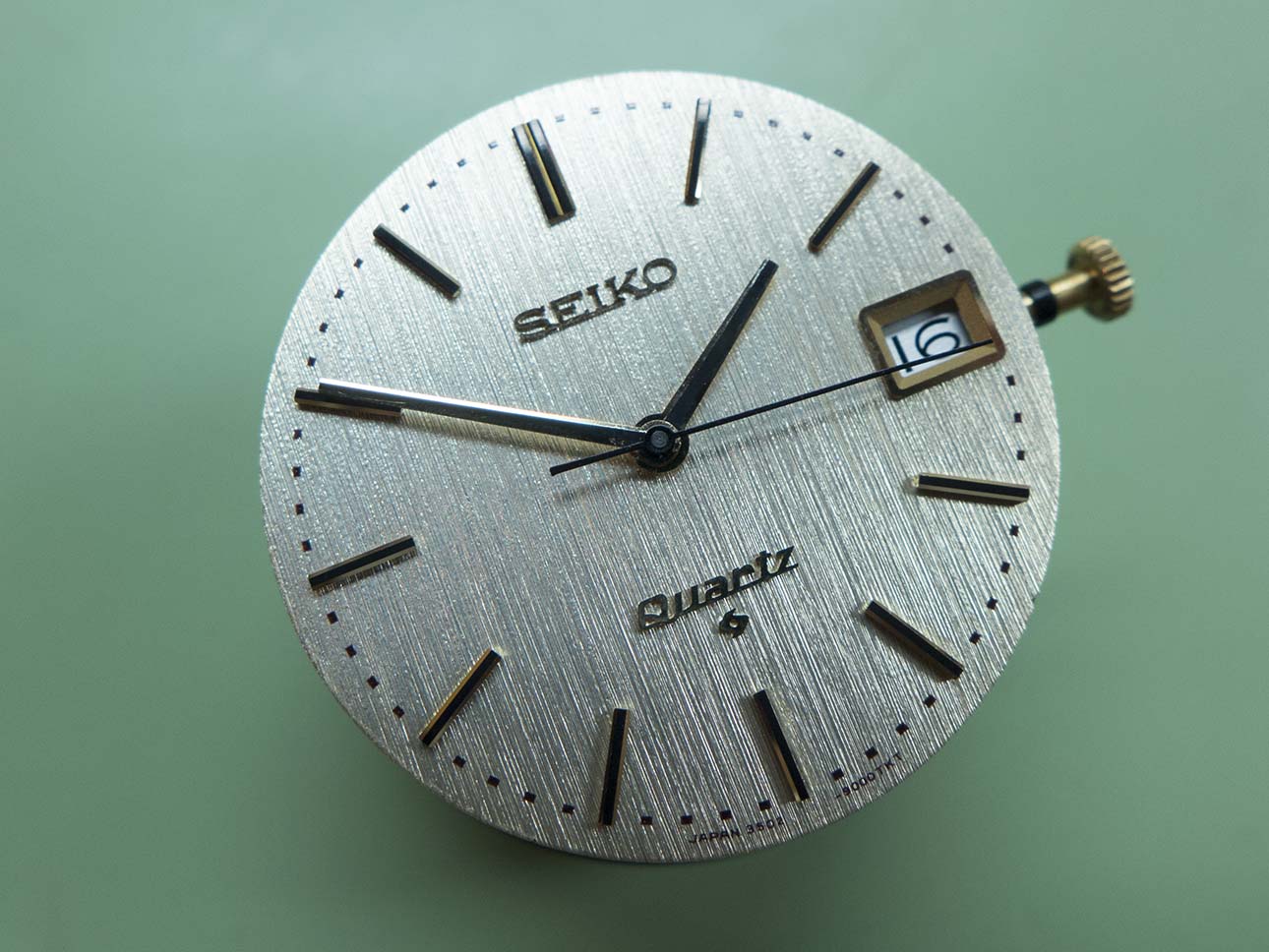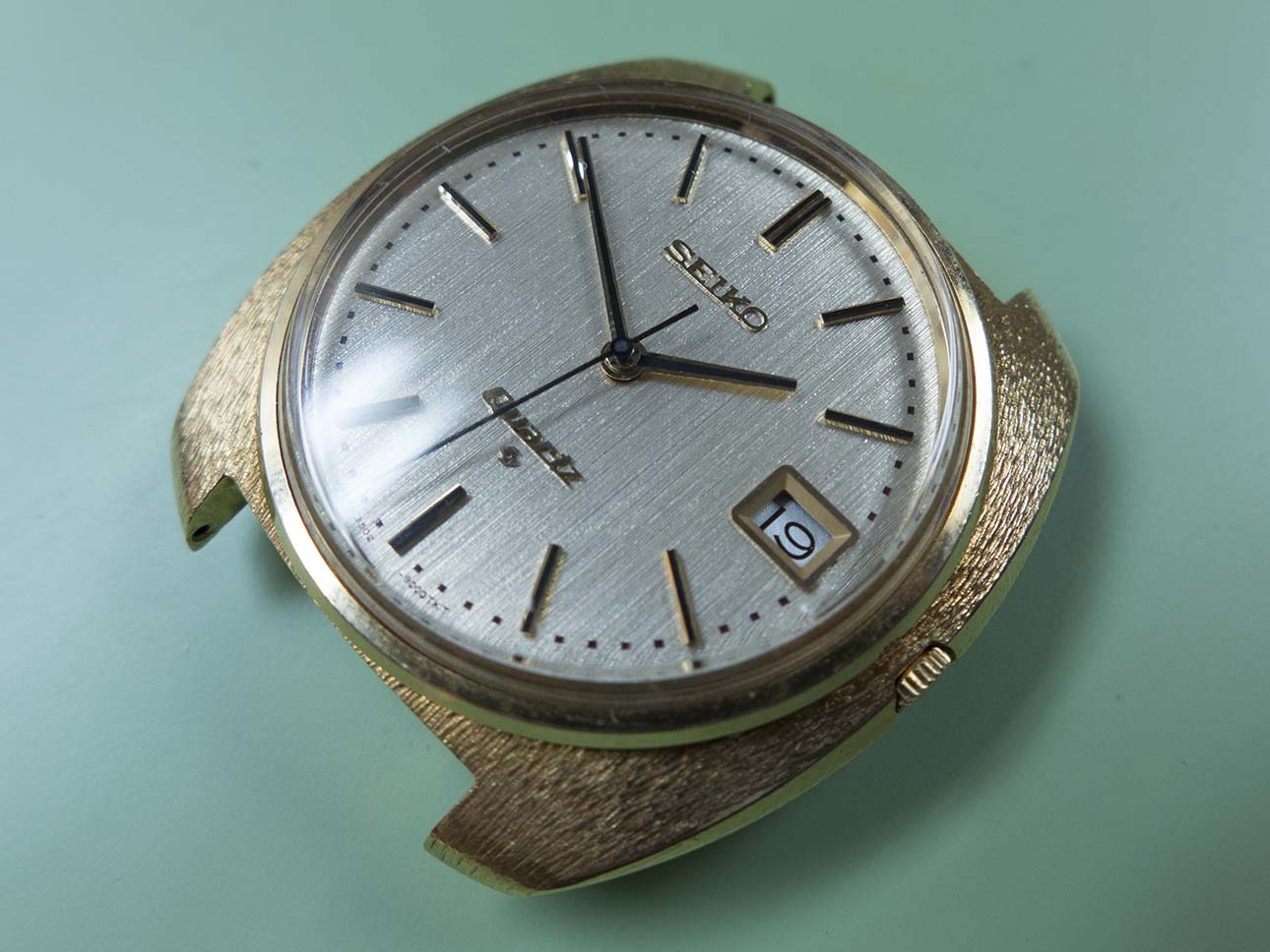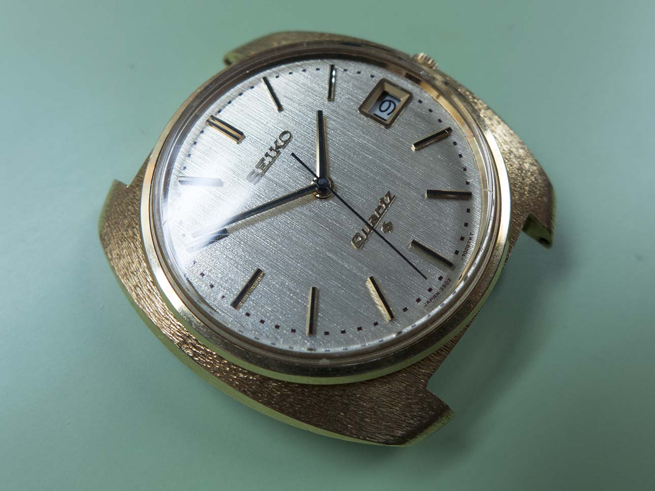 I then turned my attention to the date version. There are subtle differences between this and the none date apart from just the date window. There is an applied “Quartz” logo in gold at the six o’clock position and the “Quartz Astron”script has disappeared from below the Seiko logo.