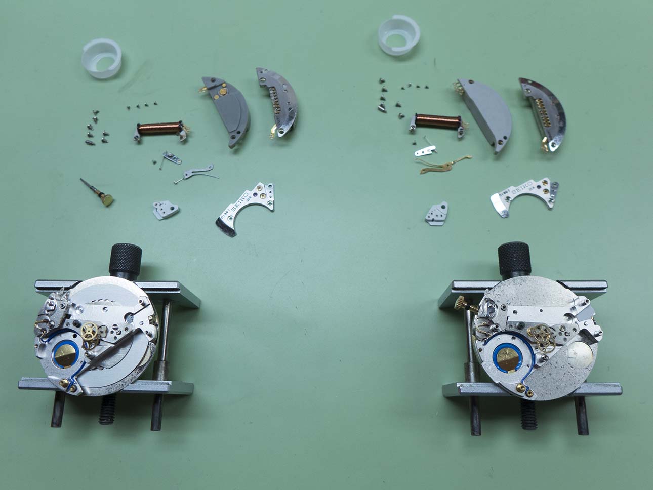This meant I needed to strip both movements of the circuitry and swap over the components. We agreed it would be best to swap everything from one to the other due to the differences in the connections and circuitry, as this included the coils it meant the bridges had to come off again.