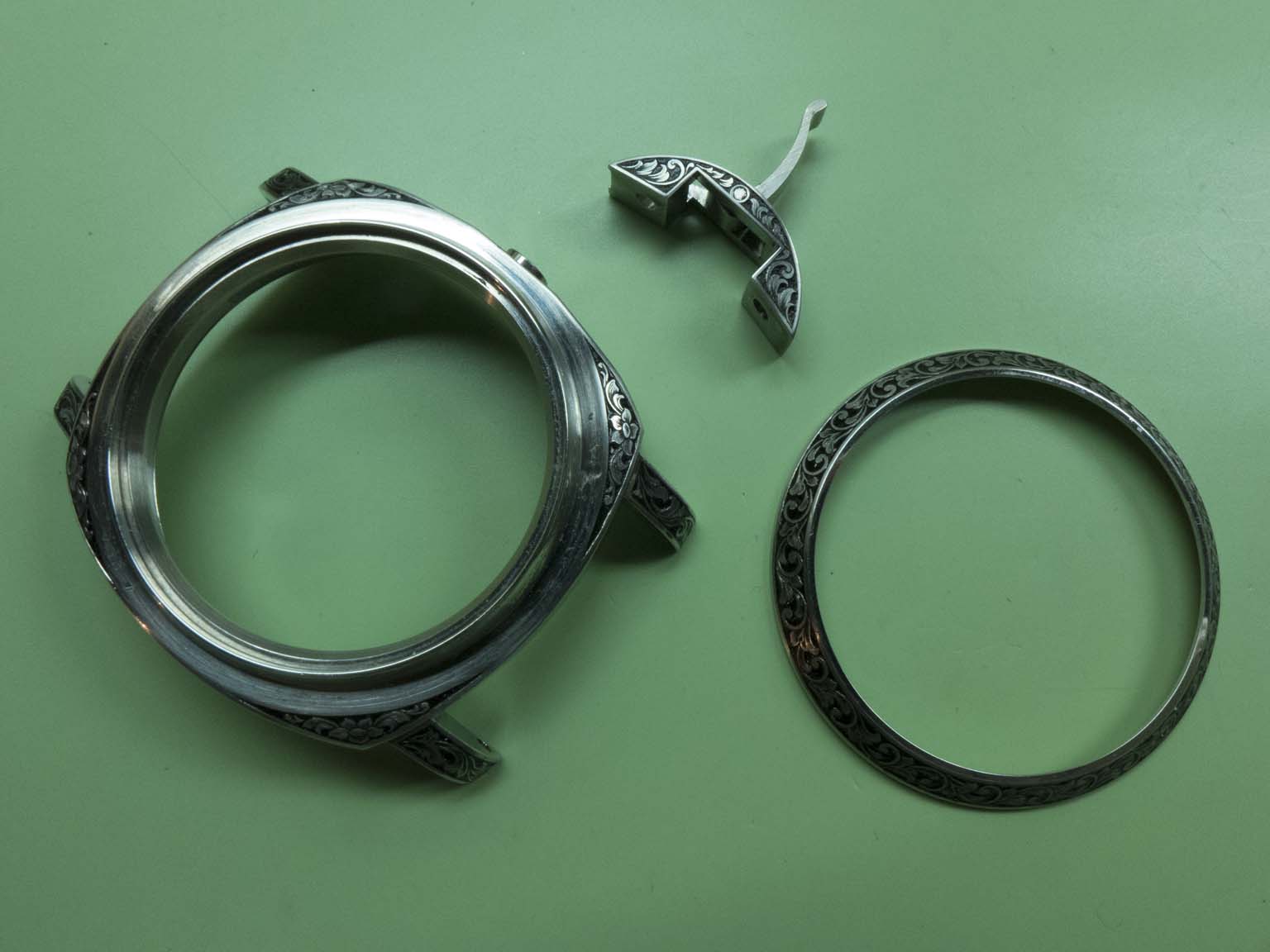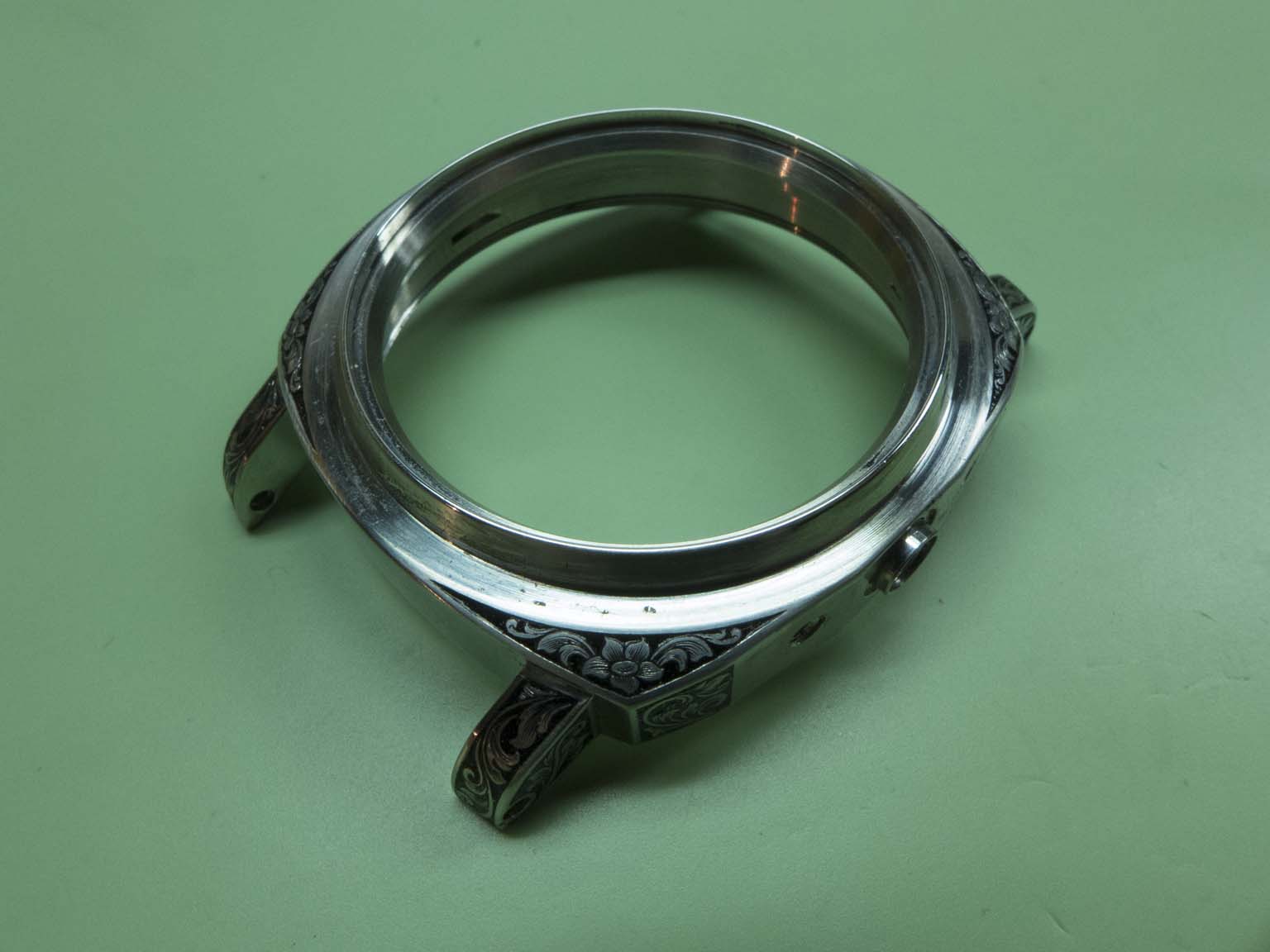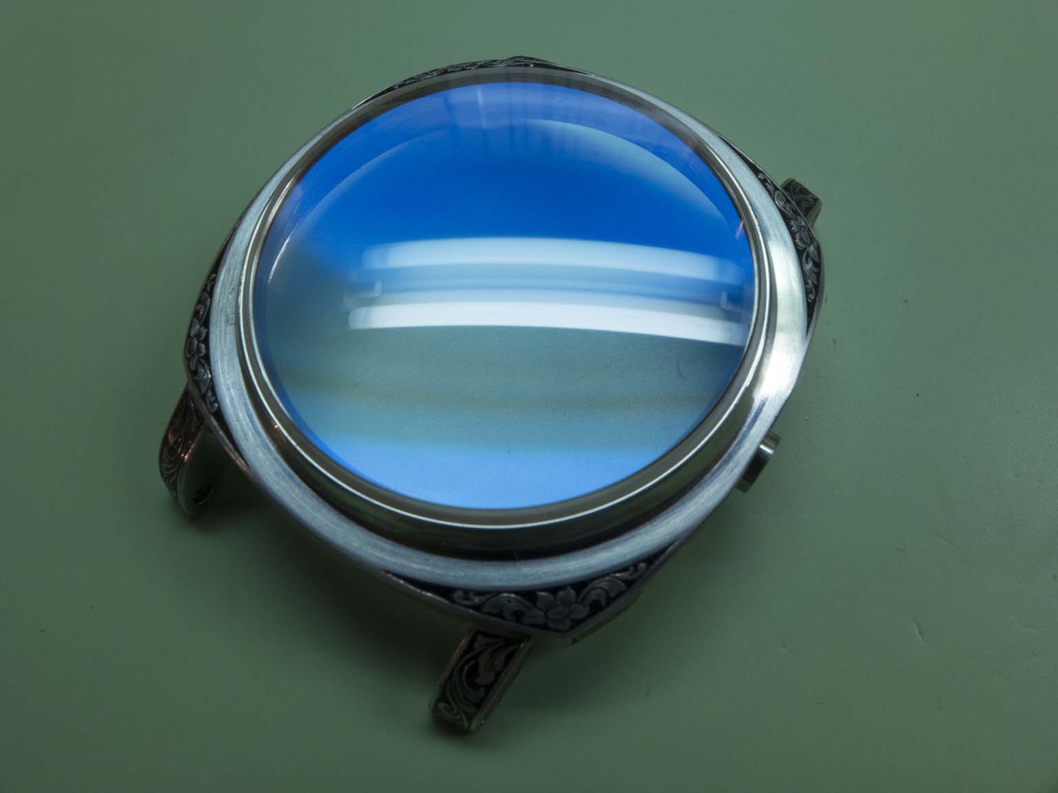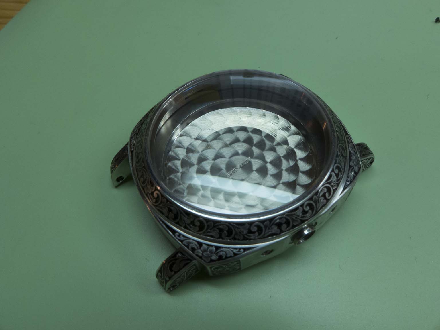 The case had been off to Viljo Marrandi for some beautiful engraving work. This man is a master of his craft and has much longer waiting lists than even I do 🙂 There was also a new AR coated crystal in the package so that was fitted ready for the movement.