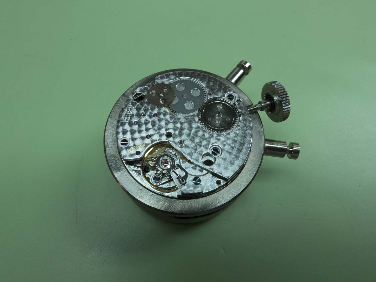The jewels and caps were fitted to the balance and the hairspring checked for concentricity, centering and flatness.