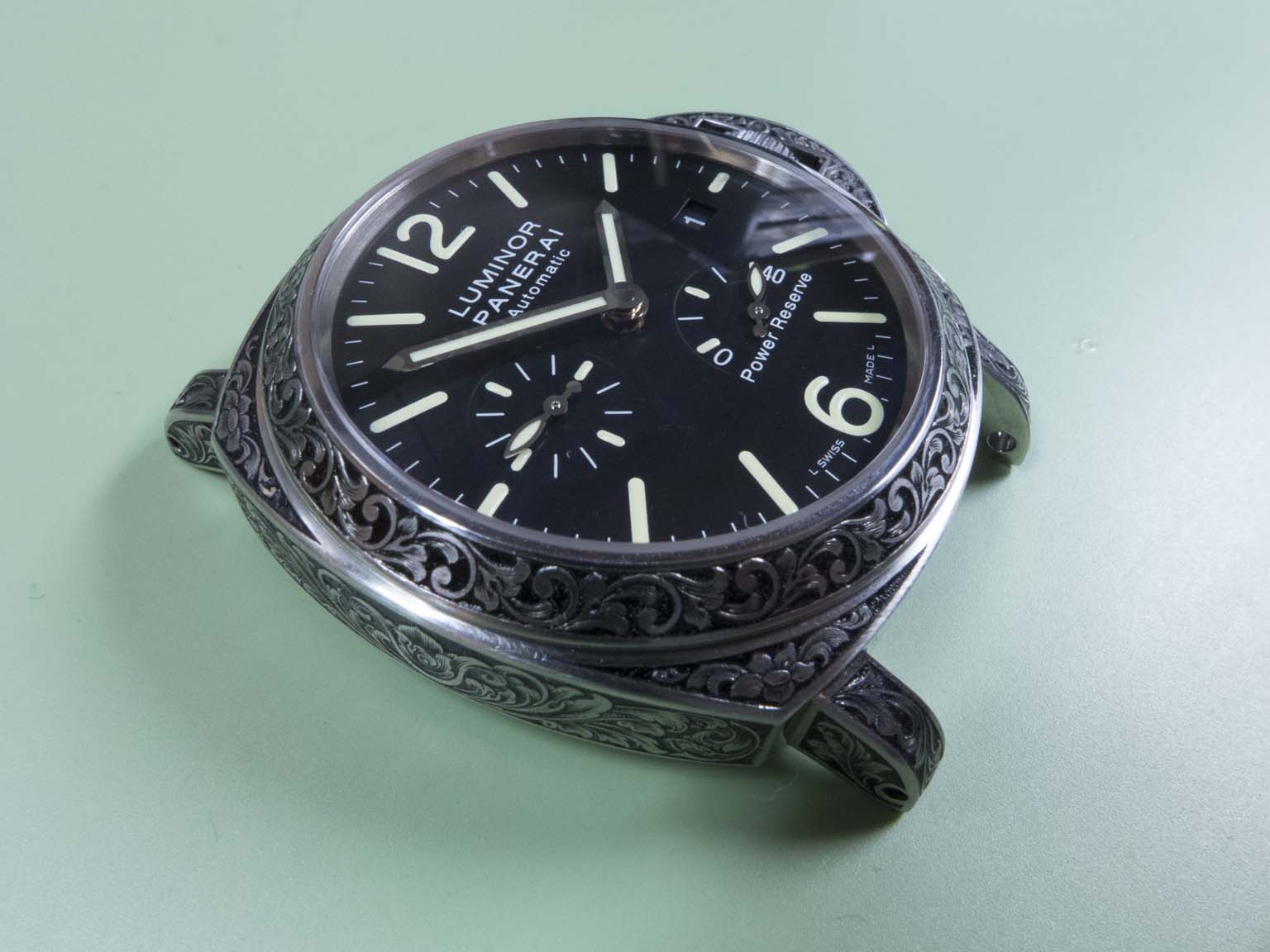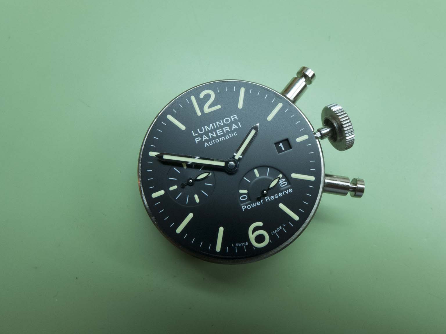 I completed this unusual job (all will be revealed later) over a year ago and have been meaning to post about it ever since, stumbling across the photographs on my hard drive the other day means I’ve now finally got it done! The watch, a Panerai PAM90 was bought for the owner by his wife as a wedding present 11 years ago. It came brand new from a dealer and as such was box fresh! After the intervening years he found he wasn’t wearing the watch as much as he’d like to, so as it was a watch that would never be sold he set about giving it a little makeover. The watch arrived here for me to strip the case and return it to the owner then service the movement. Meanwhile the owner was planning something special with the case! 🙂