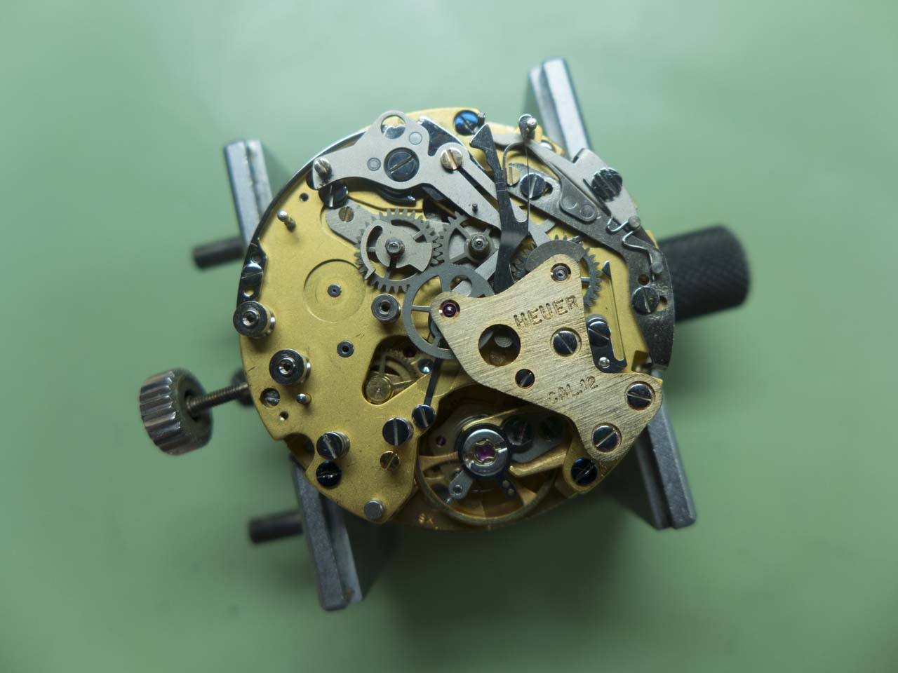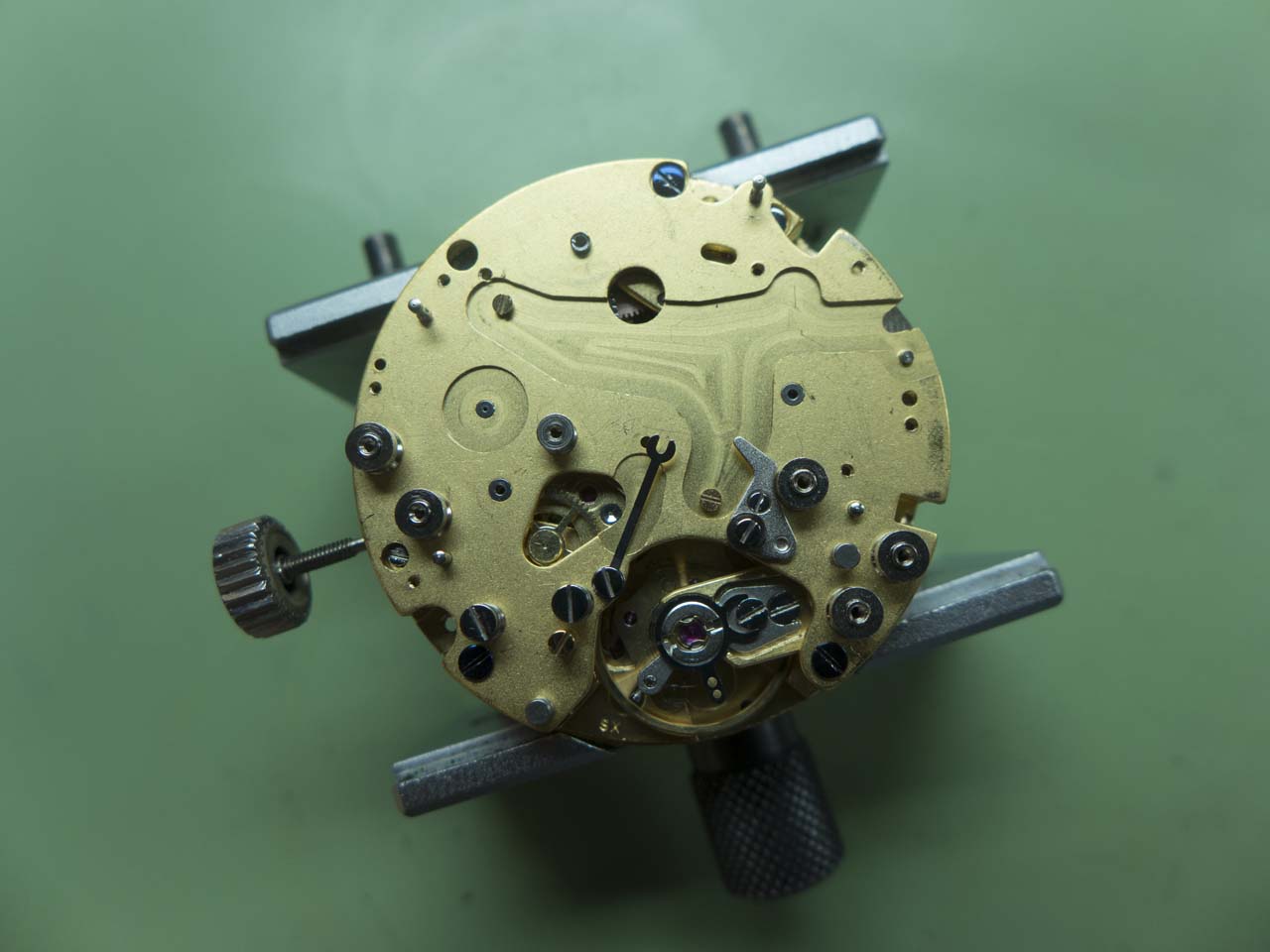 Turning the movement over I start with stripping the chronograph lever work. A nice feature of this calibre is the modular system of assembly meaning if you need to address anything to do with the wheel train the chronograph work can be removed completely with just three screws.