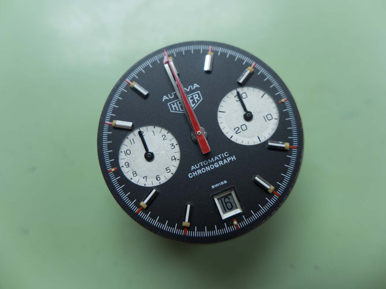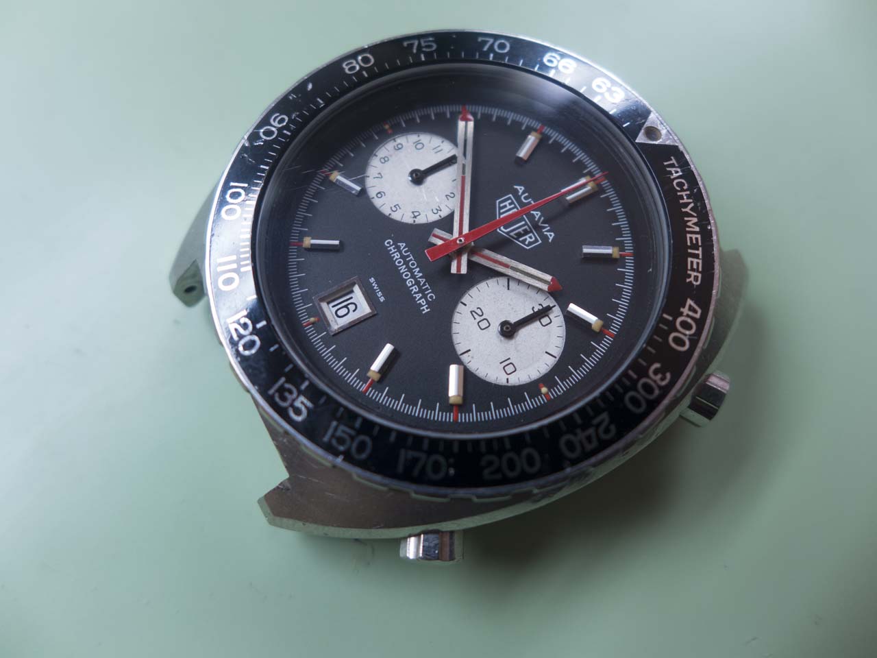 The Heuer calibre 12 movement was a development of the calibre 11 which preceded it, and the calibre 11 was developed by the ‘Chronomatic’ partnership of Heuer, Breitling, Hamilton-Buren and Dubois-Depraz in an attempt to be the first to the market with an automatic winding chronograph. It was revealed to the press on March 3 1969 in press conferences in NewYork and Geneva and was manufactured until about 1973. The calibre 12 was introduced in 1971 and was produced until 1980. The calibre 12 addressed a few of the issues that appeared with the calibre 11’s, modifications included using lighter jumper springs, a weaker mainspring to drive a redesigned date mechanism, some strengthening of various levers and hammers and a faster beat rate of 21,600 as opposed to the cal 11’s 19,800. This family of chronographs do have a few weak points, the intermediate setting wheel tends to wear the mainplate if the lubrication degrades and the lack of spares can cause issues if the mainspring or micro rotor bearings are worn.