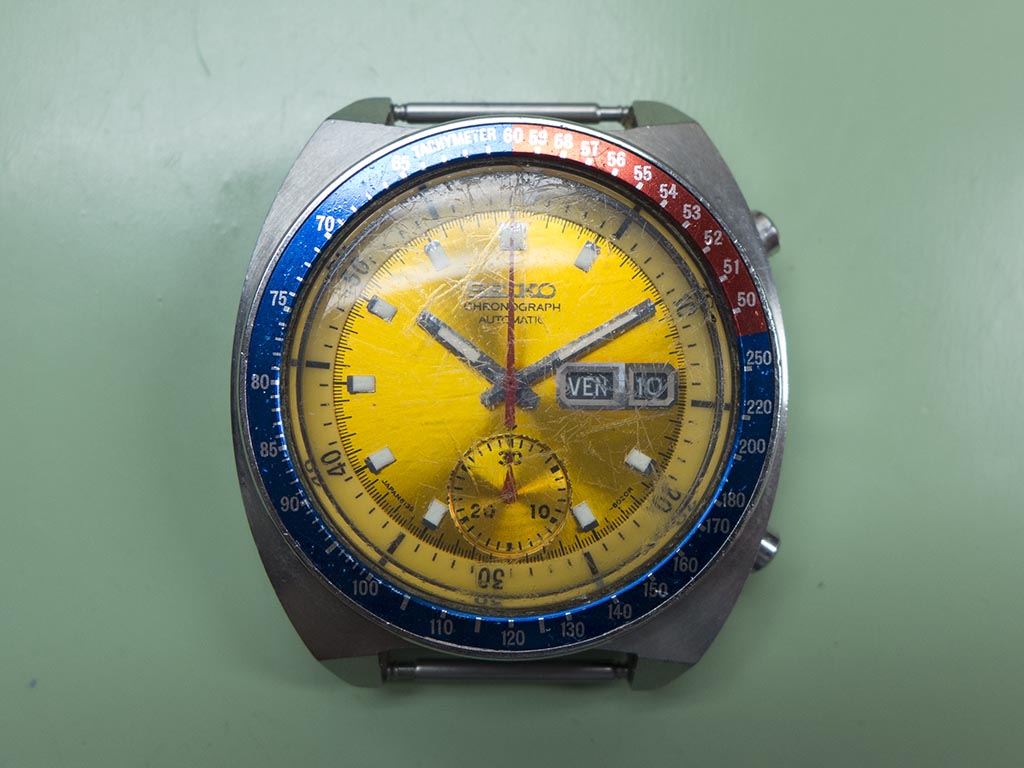 Seiko is well known for getting their 6139 chronograph to market in February 1969, the first automatic chronograph available to the public at that time. The story goes they wanted to release the twin register 6138 first, but because of the extra layer of components for the hour recording wheel it’s a more complicated watch than the single register 6139 and it wasn’t moving forward as fast as they’d like. Consequently they focused their energy on getting the 6139 to market to try and beat the two other contenders who were also developing automatic chronographs, namely Zenith-Movado group and a joint effort from Breitling, Hamilton/Bren, Heuer/Leonidas and Dubois-Dpraz. The arguments are still being done to death as to who actually was the first to market but my take is Seiko takes that accolade, your views may differ! This 6138-3002 came in for a full movement service as it wasn’t running correctly and a new crystal.